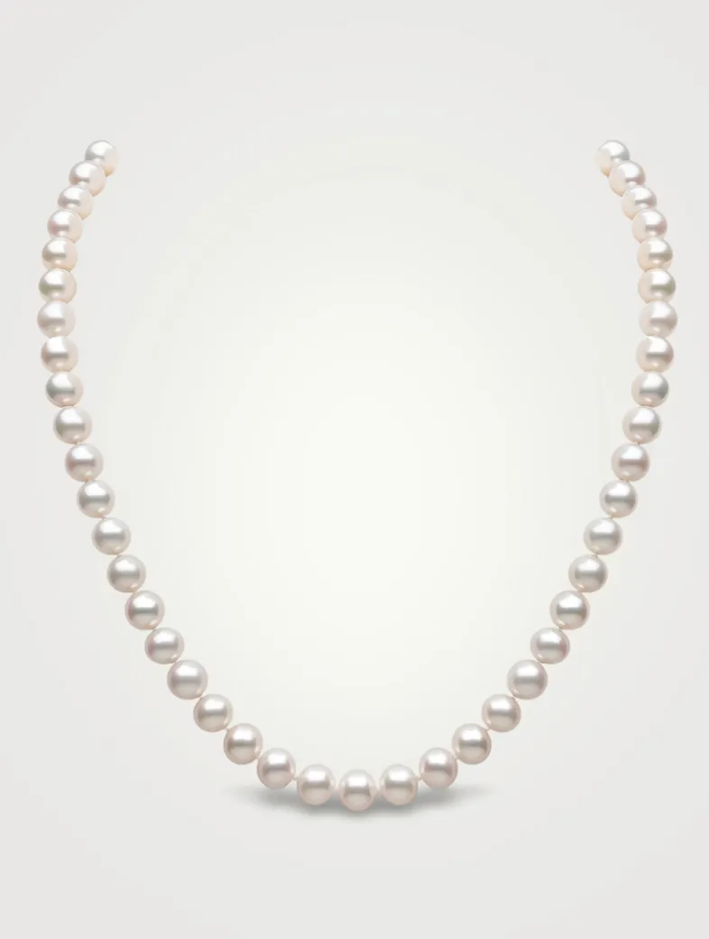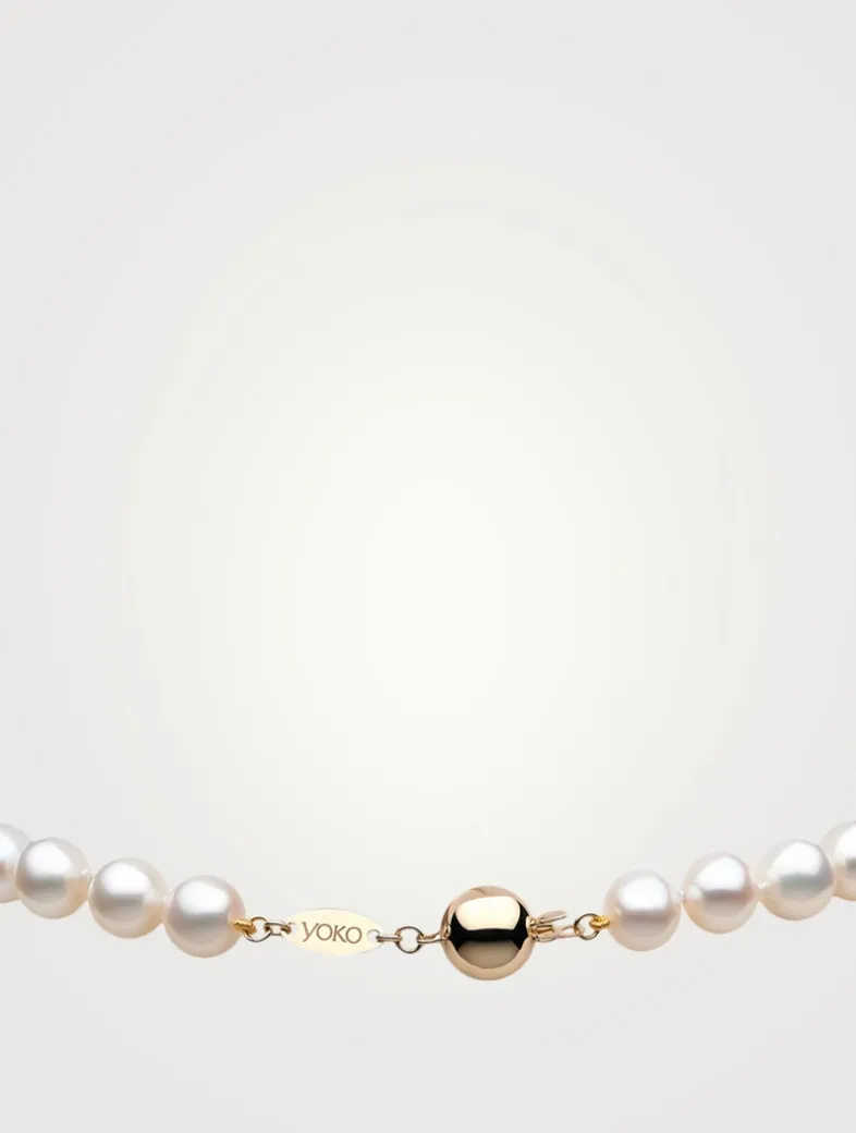 This elegant strung necklace is designed with white freshwater pearls, and finished with an 18kt yellow gold ball clasp.