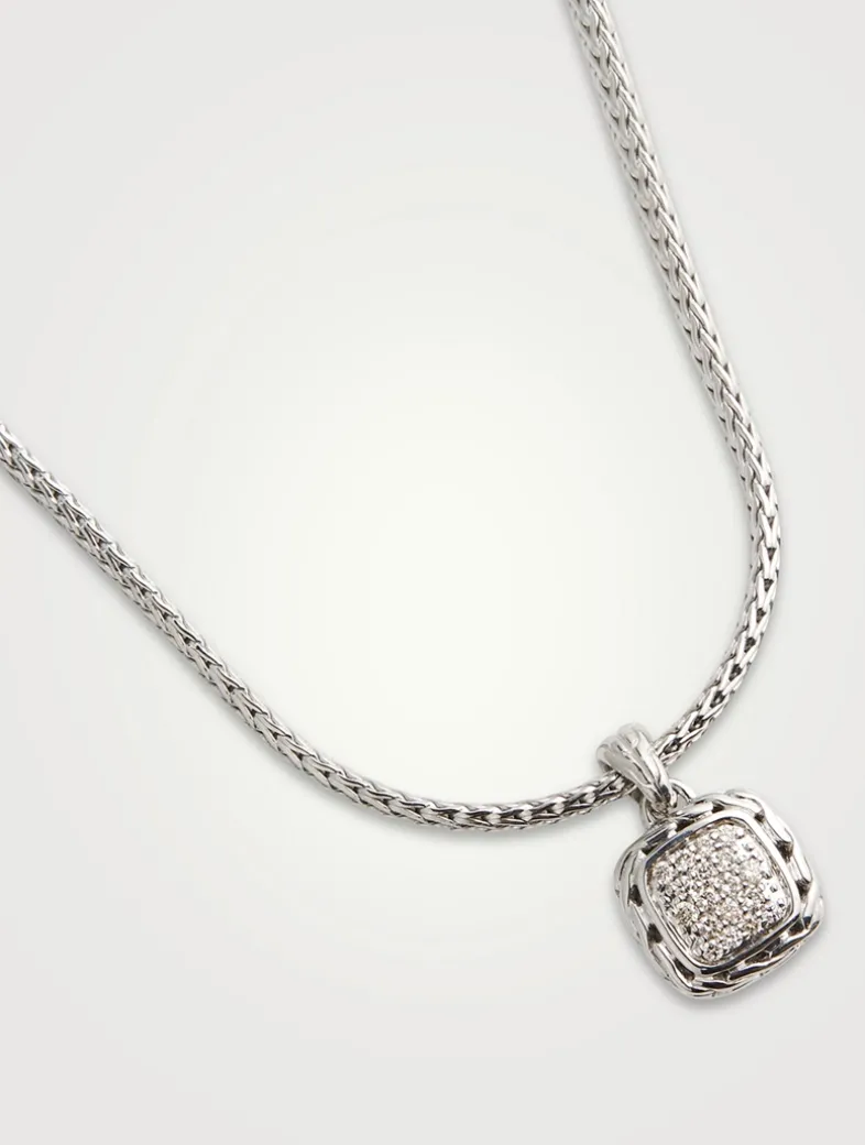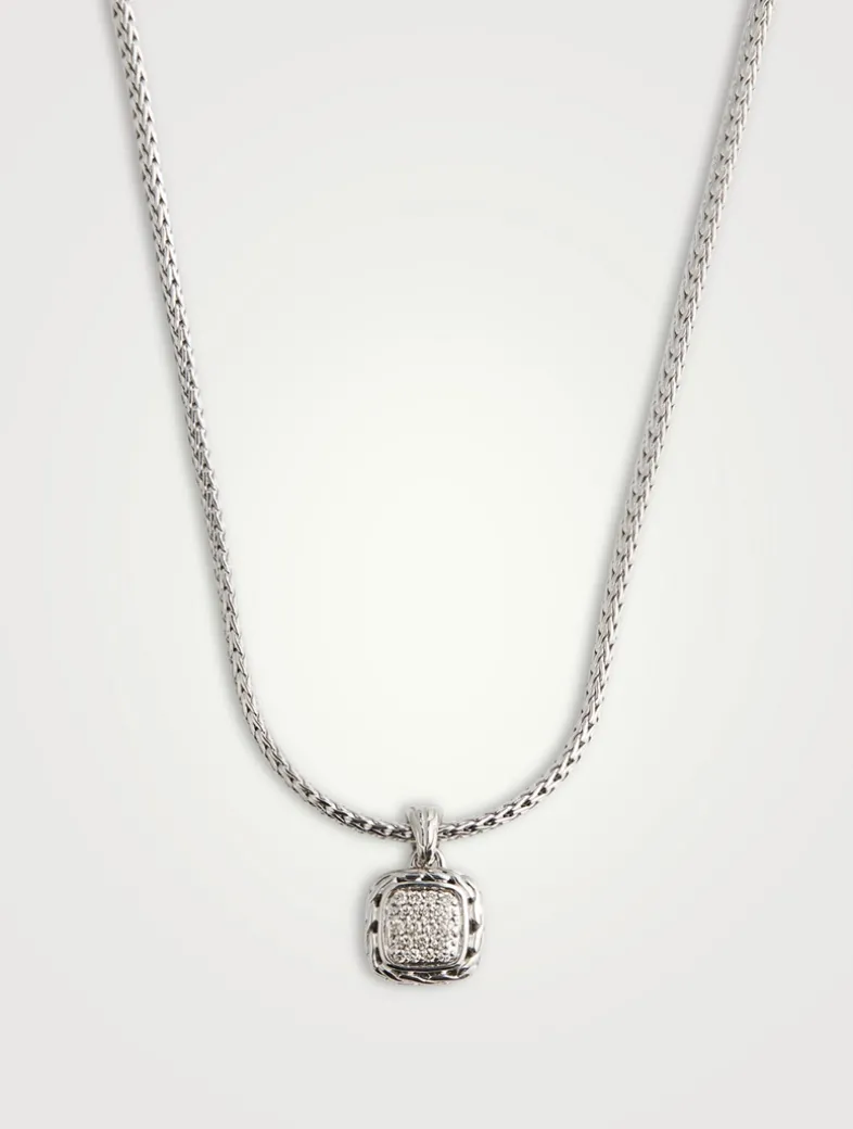 JOHN HARDY’s iconic Classic Chain Collection is a symbol of eternal human connection and community bond. This piece is features a square pendant encrusted with diamonds.