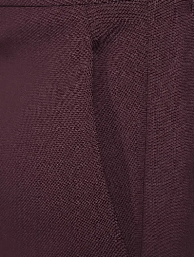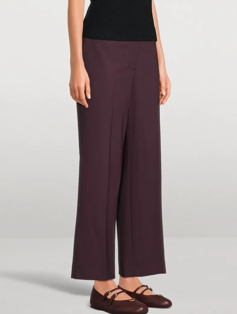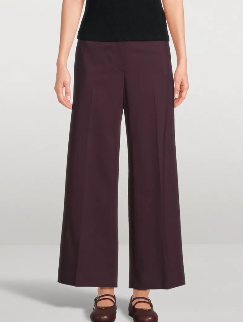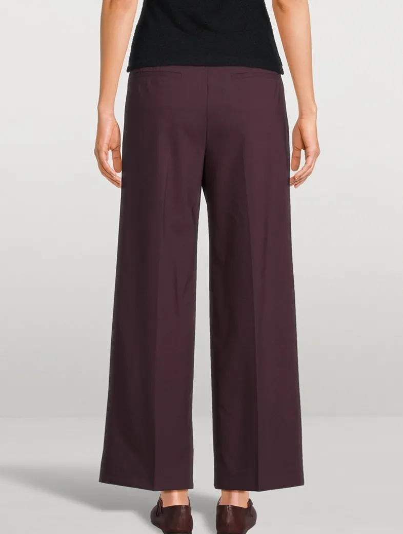 Cut from smooth stretch wool, these classic wide-leg trousers are designed with belt loops, side pockets, back welt pockets, and a button-zip closure.