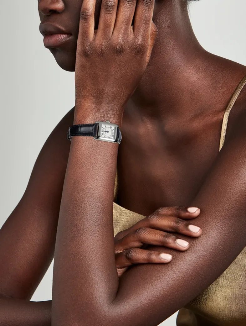 This glamourous watch has a square shape, classic white dial with intricate “Clous de Paris” decoration and uniquely-placed Roman numerals. The croc-embossed leather strap finishes the look.
