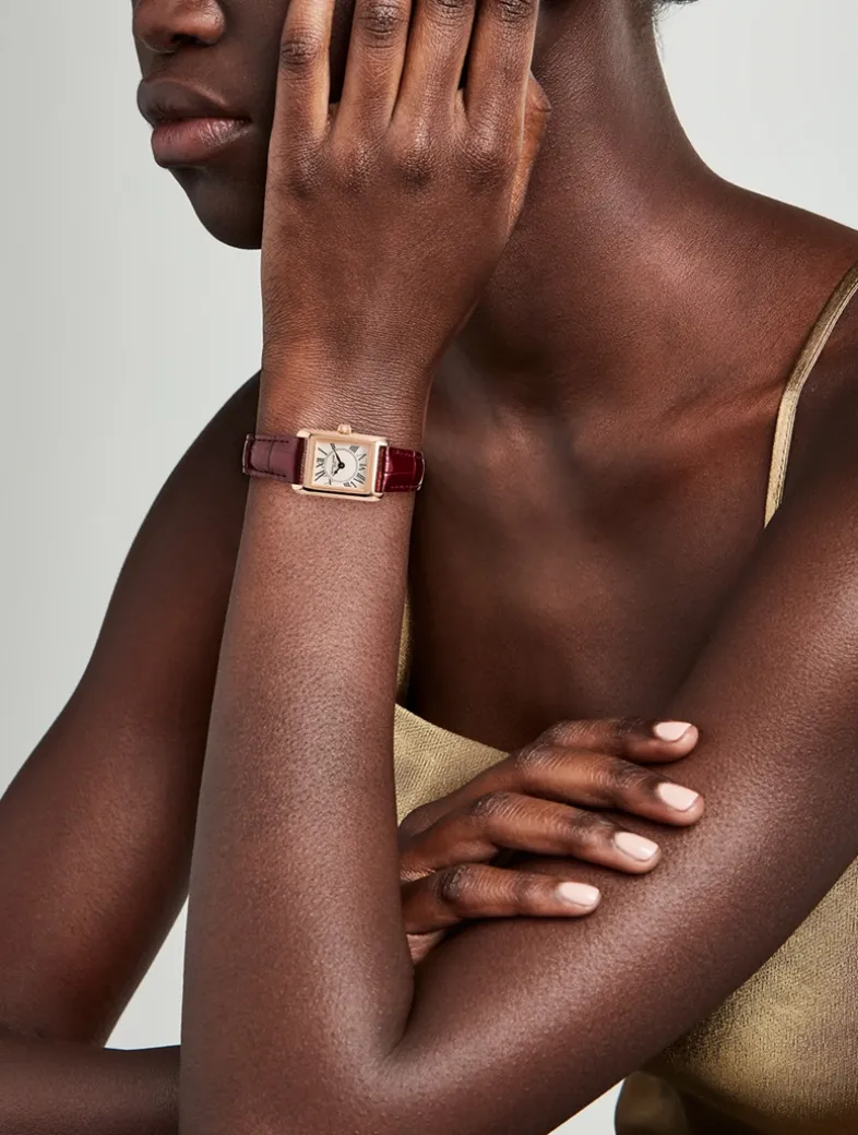 Timeless and luxurious, this Classics Carrée watch from Fréderique Constant evokes glamour with its square shape, and classic white dial with intricate “Clous de Paris” decoration. The gold case is perfectly offset by a rich red leather strap finished with crocodile embossing.