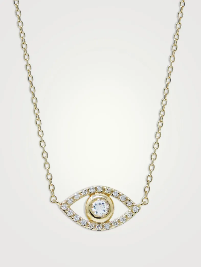 Crafted with a thin yellow gold chain, this whimsical necklace features a delicately suspended Evil Eye pendant with pavé set stones and a gemstone centre.