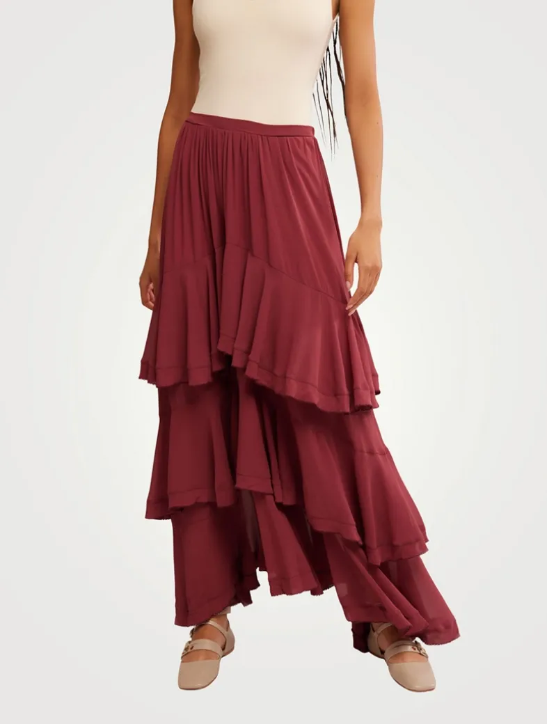 Timeless and tiered, this essential maxi skirt is the perfect transitional staple. Cut to a mid-rise elastic waist, it falls to a billowing silhouette with semi-sheer panelling and a partial lining.