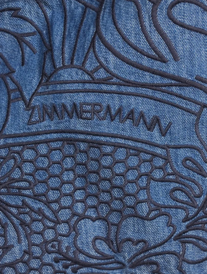 A boho take on denim, these mid-rise shorts feature heavy embroidery and delicate scalloped edges. They have a drawstring waistband with toggle ends, chain stitch belt loops at the side seams, and an invisible zip at the centre back.