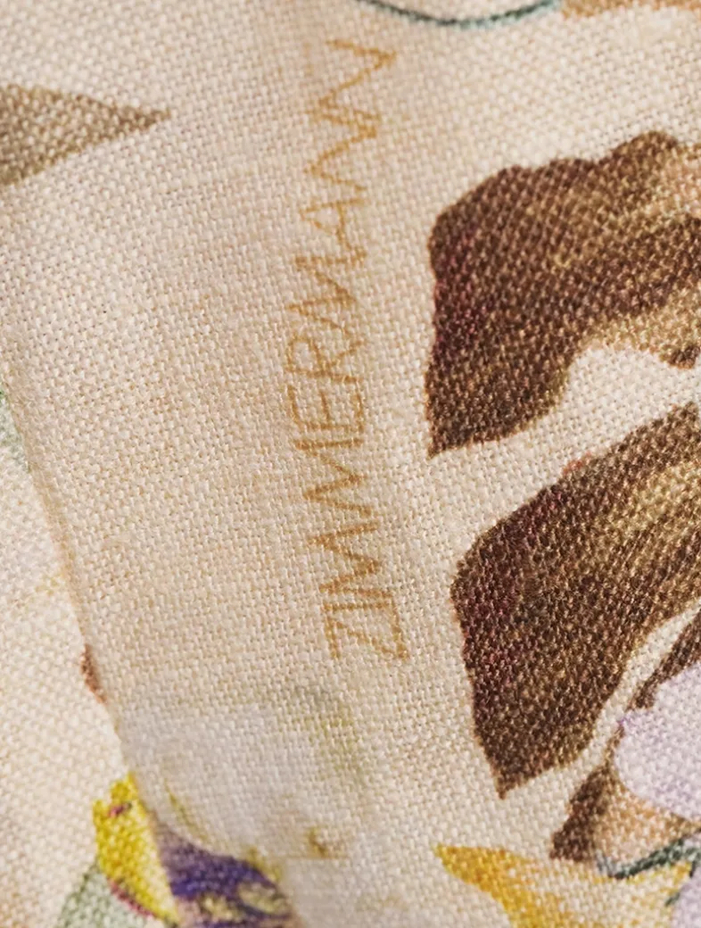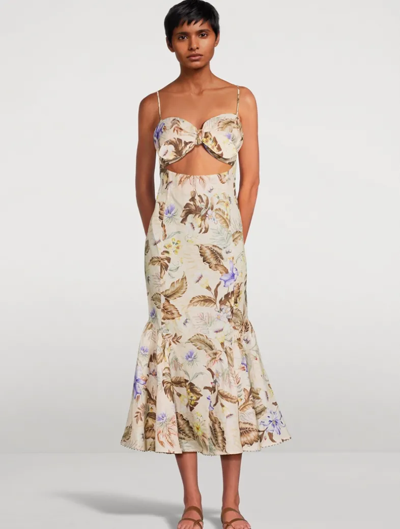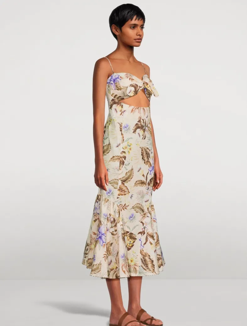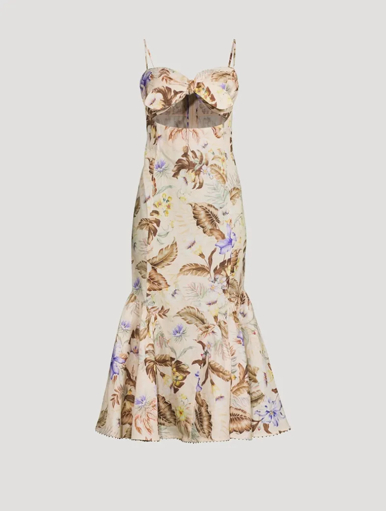 Defined by a striking silhouette, this floral-print linen dress makes a bold statement. It has a sweetheart bodice with interior boning, bow detailing, and a skin-baring cut-out at the front. Finished with a curve-hugging skirt that flares into a frilled mermaid hem.