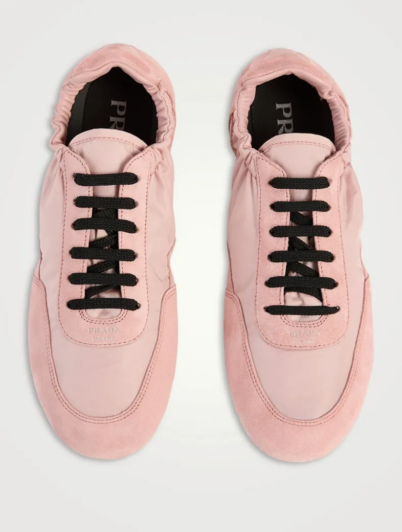 This incredibly lightweight sneaker with a structured design made of Re-Nylon and suede features a mix of materials that embodies Prada’s sporty and artisanal soul. Its flat sole recalls the classic ballerina, enriched with elastic on the sides that makes it easy to slip on.