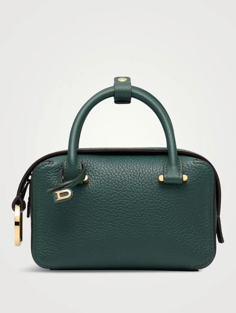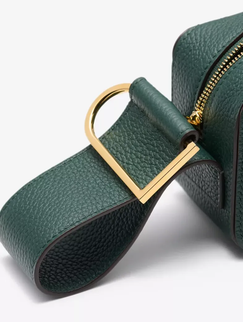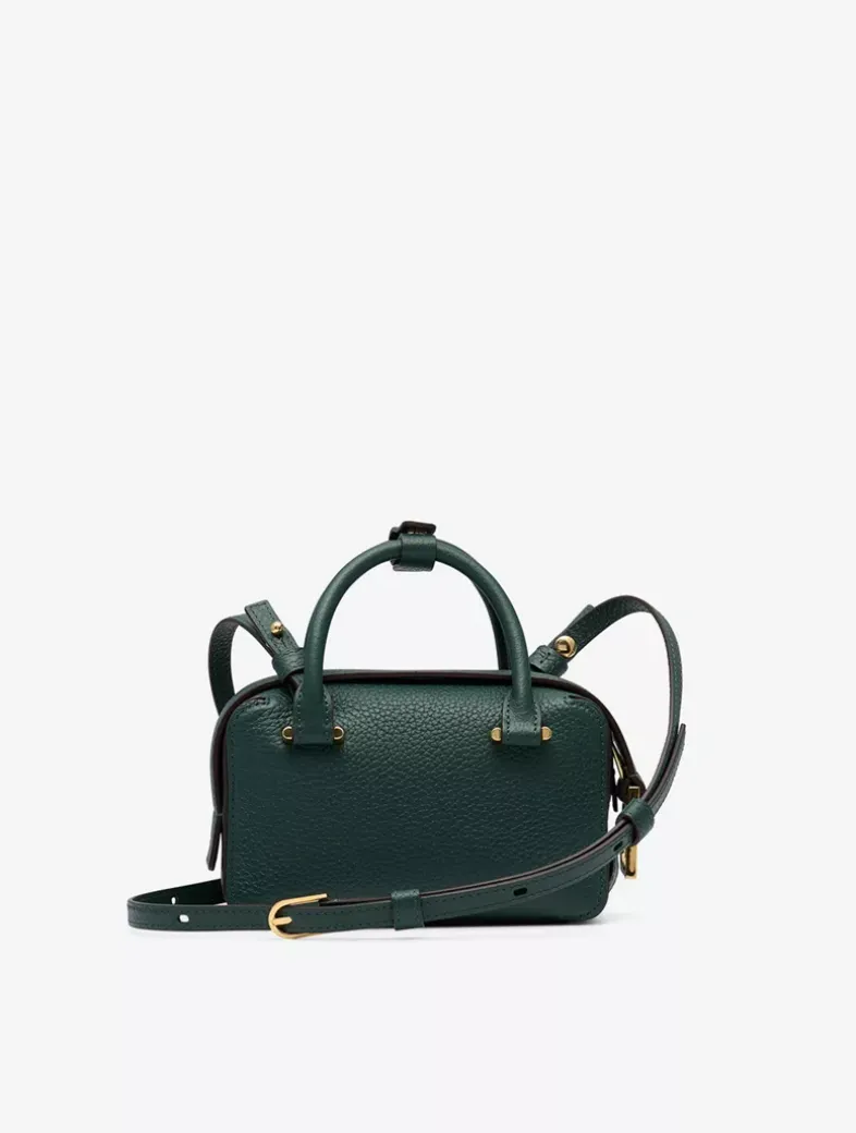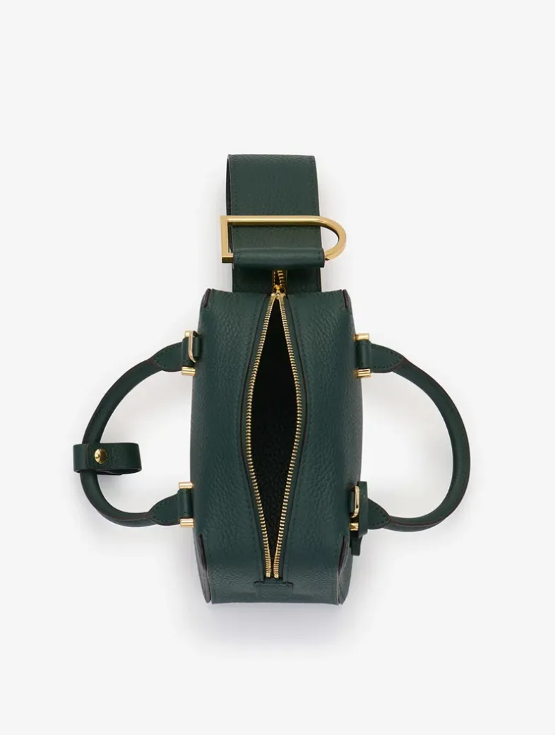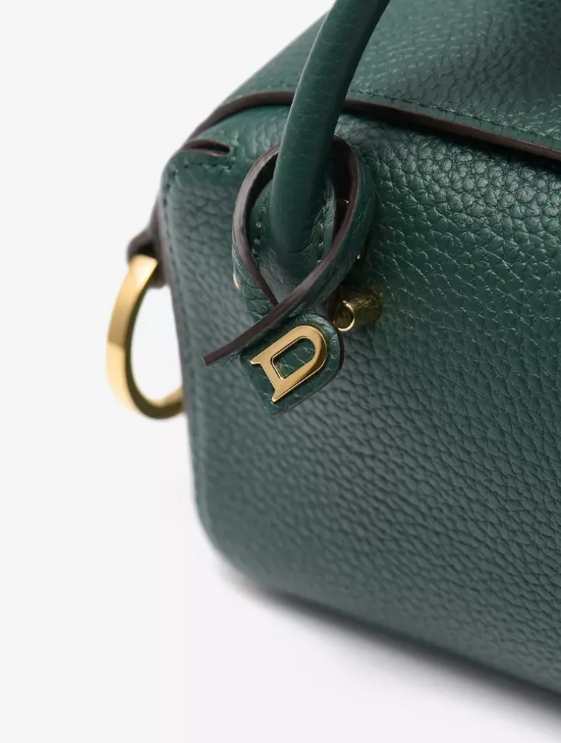 Petite top handle bag in Taurillon Soft leather. Finished with the Cool Box’s characteristic D-shaped ring detail in gold metal hardware. Features a removable, adjustable shoulder strap. Crafted in Forest, Fall-Winter 2023’s crisp, dark green.