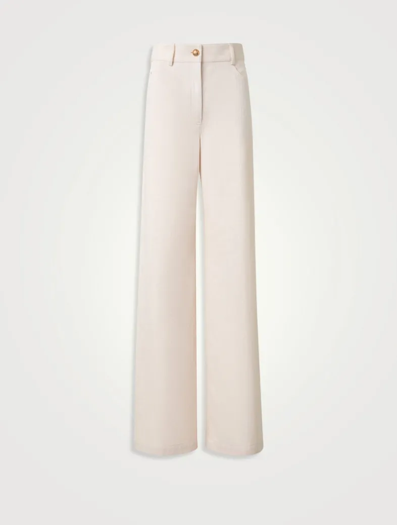 An elevated take on denim, these pants are made from a cotton and wool blend with a hint of stretch. They have a high-rise waist, relaxed legs, and a classic five-pocket design.