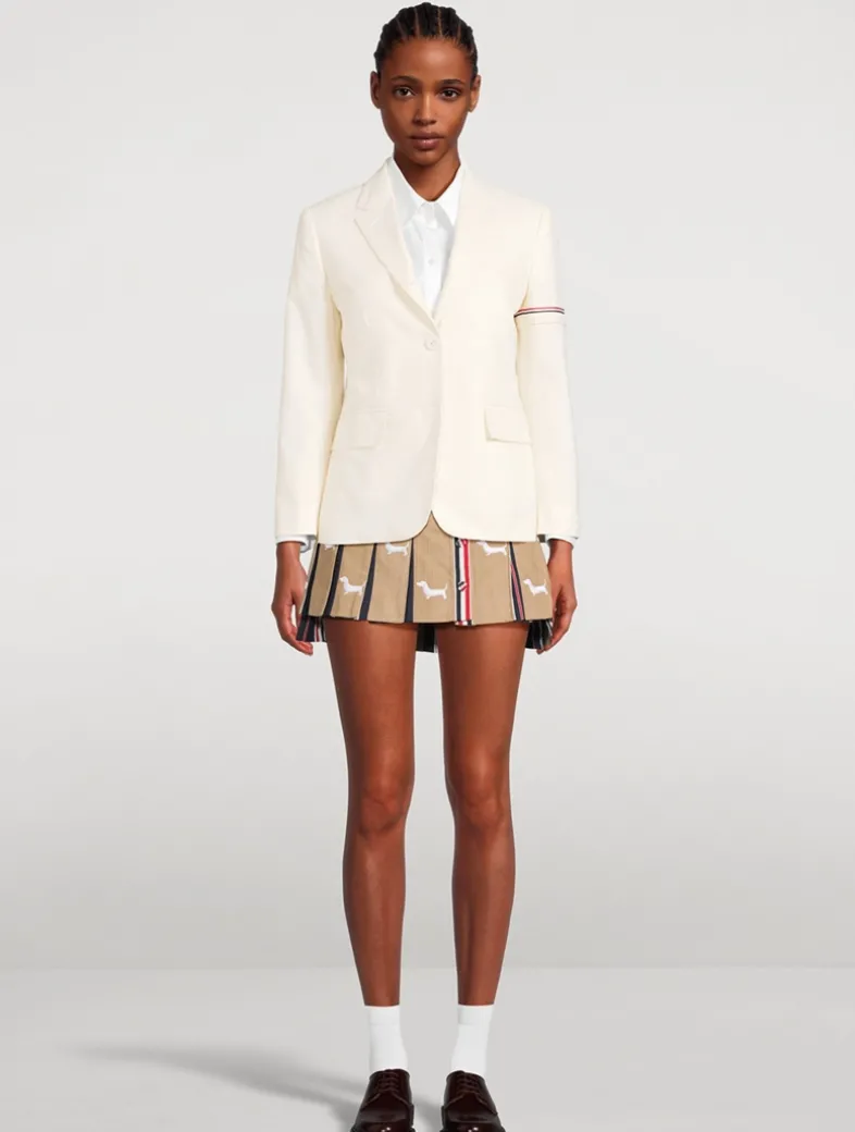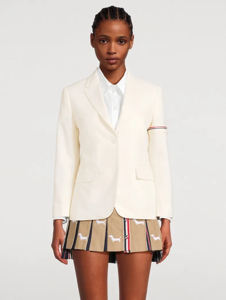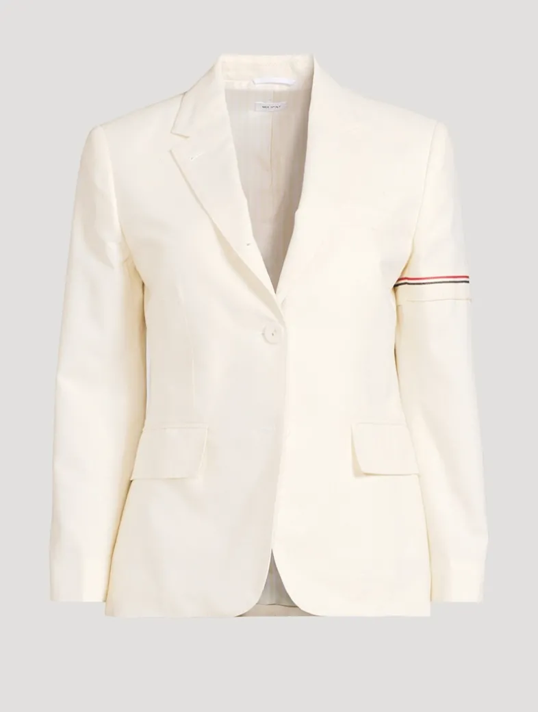 Made in Italy, this tailored blazer is crafted from a cotton canvas and cut in a slim silhouette. It is adorned with signature striped trim around the arm, at the cuffs, and at the nape of the neck.