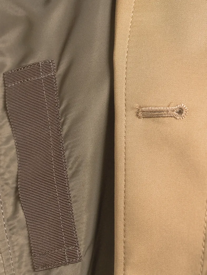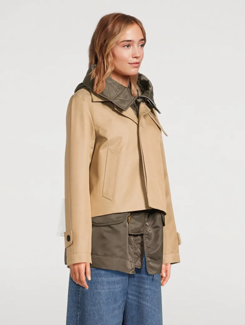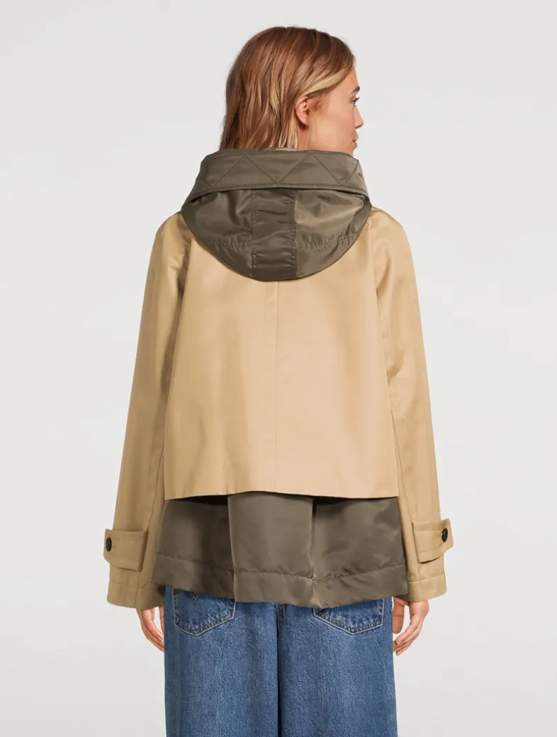 This glossy nylon twill topper is designed with an attached hood and a concealed closure. It is layered with a cotton gabardine jacket with welt pockets and button tab cuffs.