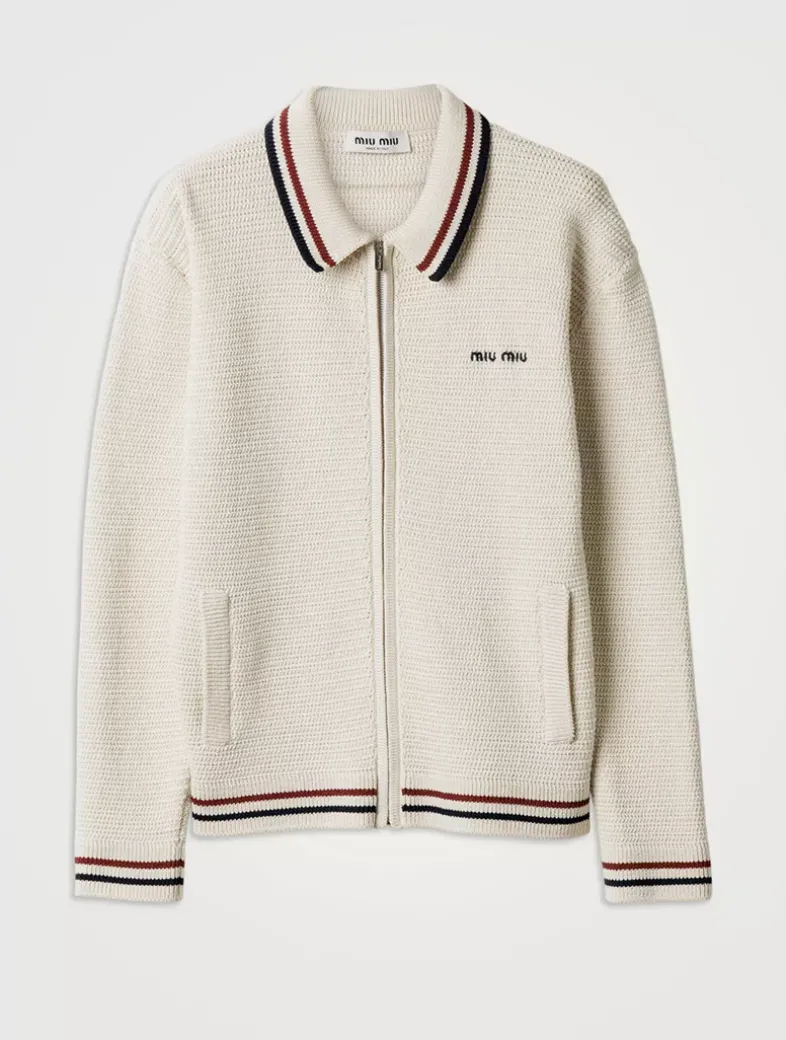 Crochet motif Menswear fit Long sleeves Front zipper closure Regular shoulder Inseam pockets Ribbed knit cuffs and hem Embroidered logo