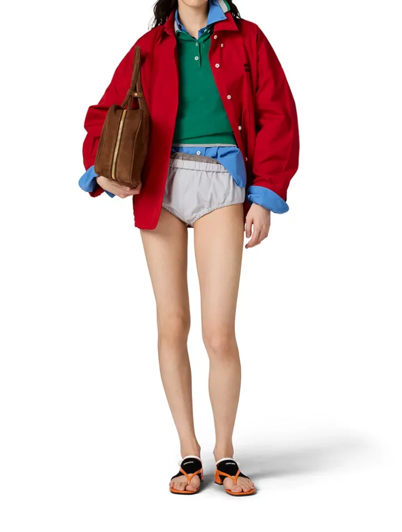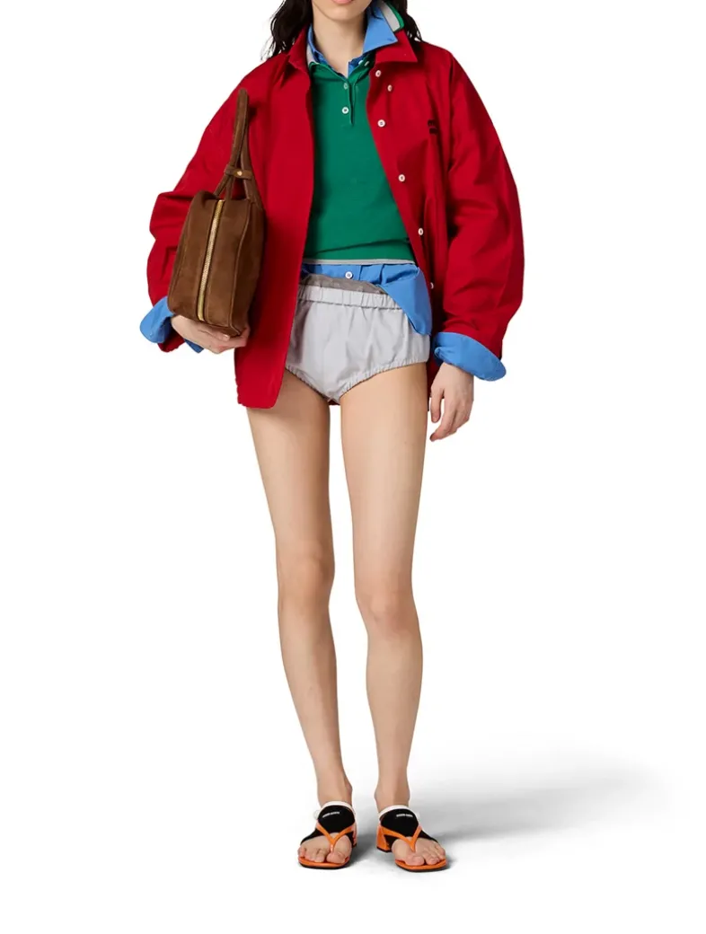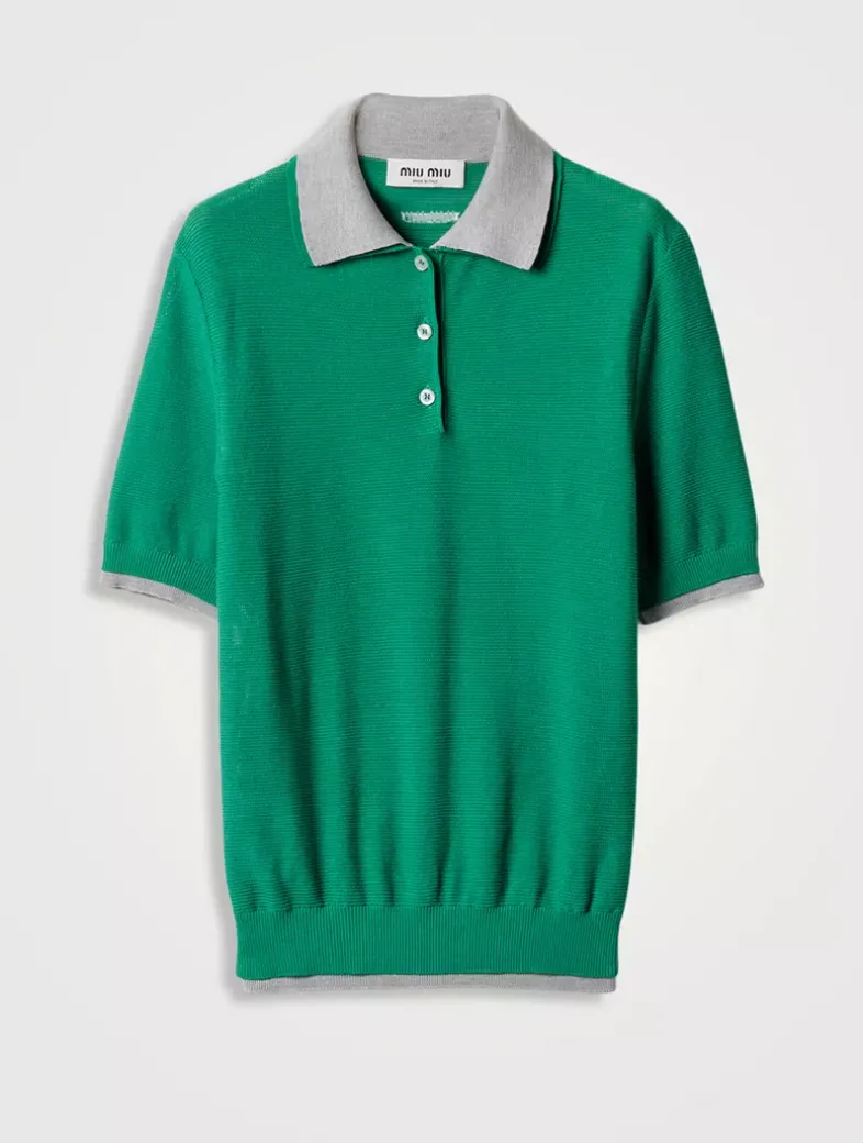 Mesh knit Boxy fit Short sleeves Semi-raglan shoulder Ribbed knit sleeve trim and hem Contrasting silk trim Front button closure Knit logo patch