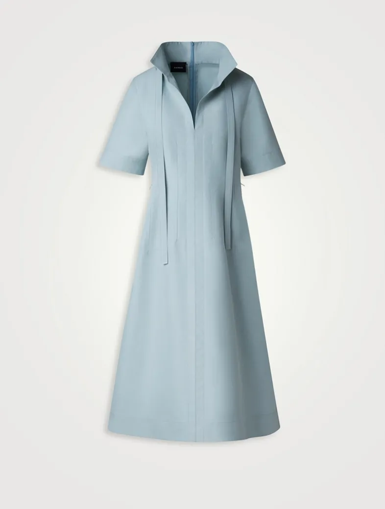 Constructed from cotton poplin, this midi dress features a stand-up collar, voluminous short sleeves, and stitched waist darts. A flared skirt gives this piece a timeless and elegant touch.