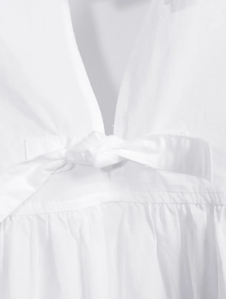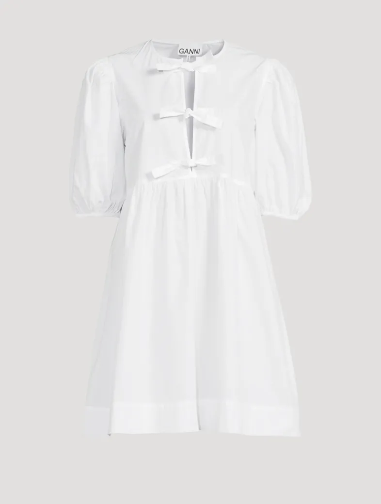 Designed for a relaxed fit, this short dress features an open round neckline with tie closures and signature puff sleeves with elastic edges. Made from 100% organic cotton, this slightly sheer mini dress is finished with a relaxed-fit silhouette.