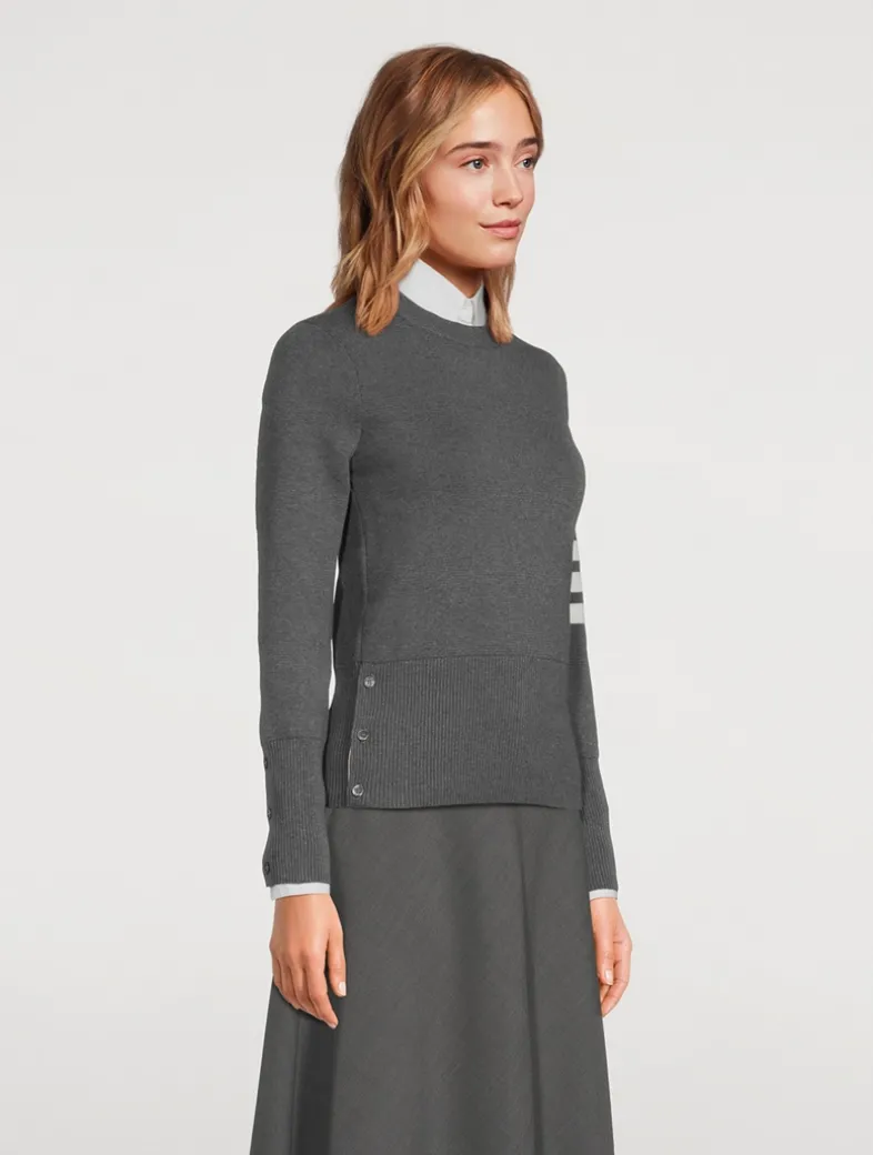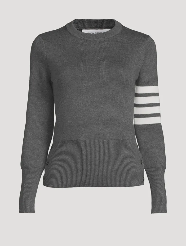 Made in Italy, this cotton knit pullover is designed with engineered 4-bar stripe at the sleeve. The sweater is finished with buttoned side vents and cuffs, and signature grosgrain loop tab at the back neck.