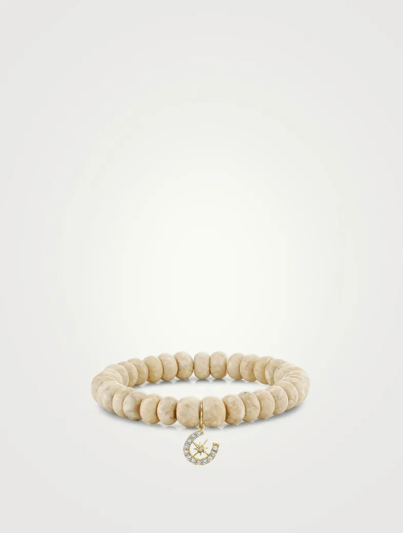 Strung with cream jasper smooth rondelle beads, this bracelet features a 14k yellow gold and diamond starburst horseshoe charm. All SYDNEY EVAN beaded bracelets are strung on a stretch cord along with their 14k gold SE logo charm.