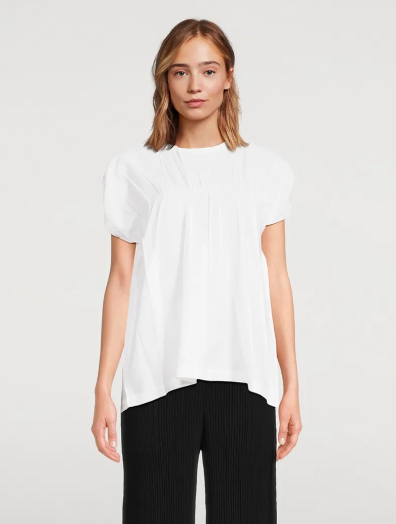 Resembling the texture of paper, Crimped And Pressed is a woven series crafted from a cotton and polyester blend, offering a light and comfortable feel. Special threads are intricately woven using a jacquard technique, intentionally shrinking the fabric in selected areas to create a dynamic interplay of texture and depth. This top has an A-line silhouette, short sleeves, and a round neckline with a two-button closure.