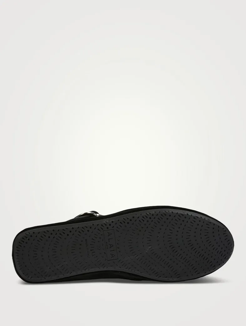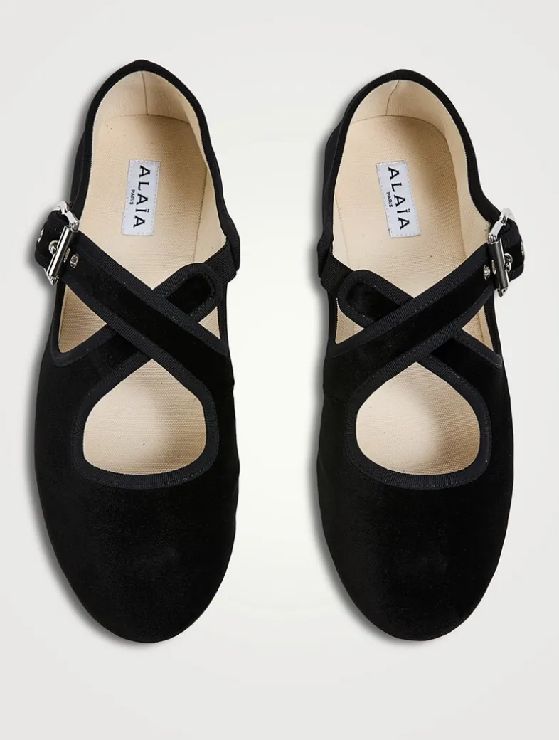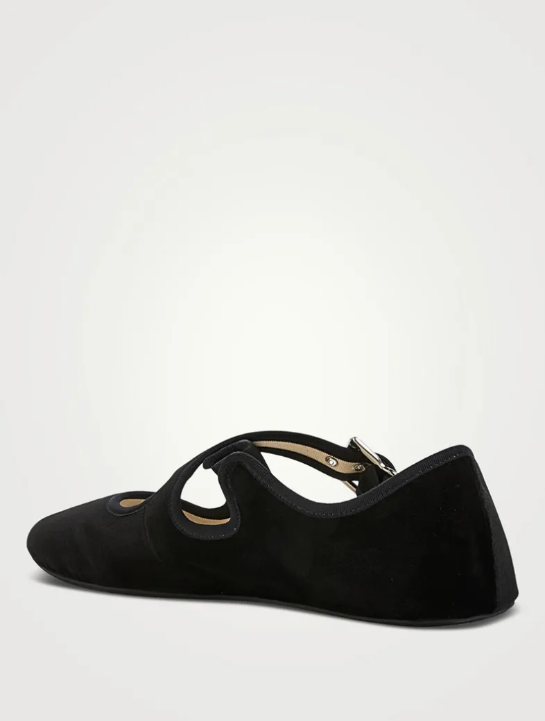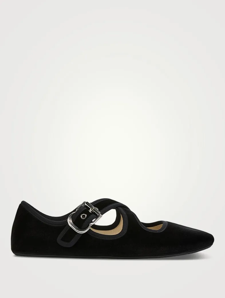 Crafted of a plush velvet and inspired by classical Japanese shoes, these round-toe shoes are topped with criss crossing Mary Jane-inspired straps with a buckle.