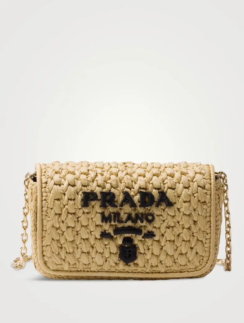 Raffia-effect yarn Chain shoulder strap. Length 110 cm – Drop 52 Metal hardware Embroidered logo on the front and enameled metal triangle logo on the back Magnetic closure with flap Nappa leather interior with patch pocket