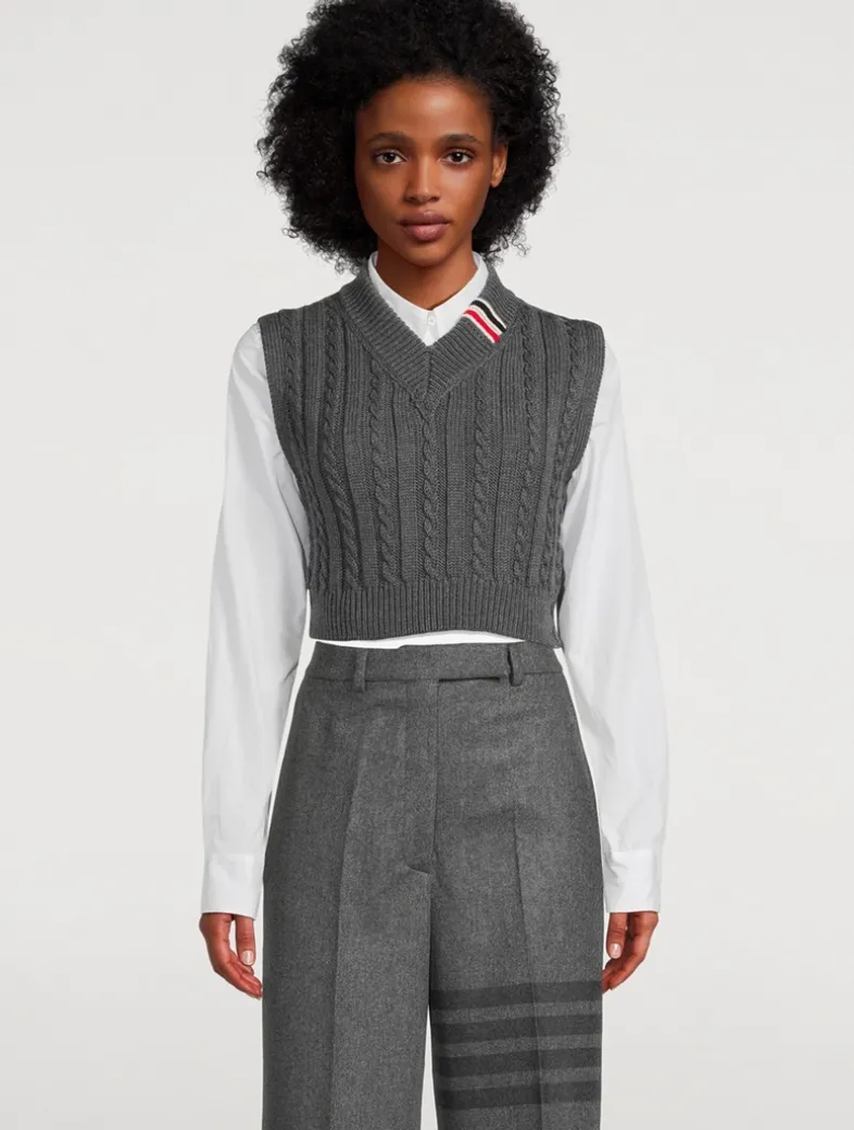 A buildable layer that adds a touch of sophistication to any shirt underneath. Find a signature Thom Browne emblem at the collar. Knit from wool with a cabled texture, it has buttoned side vents with signature striped grosgrain trim.