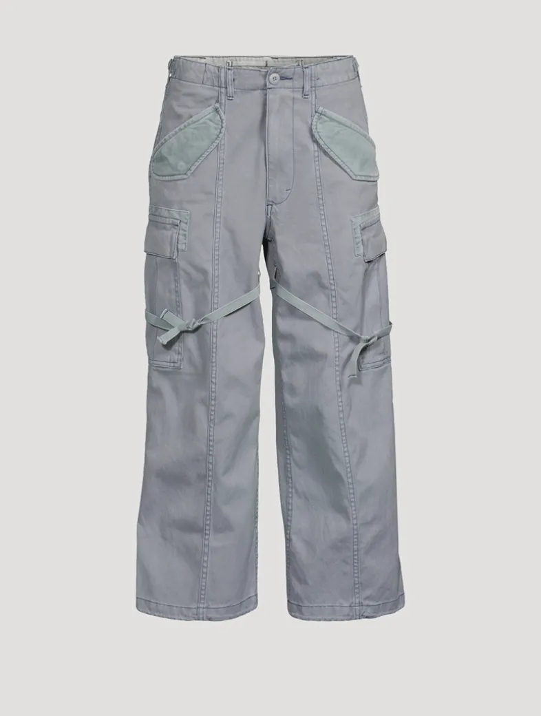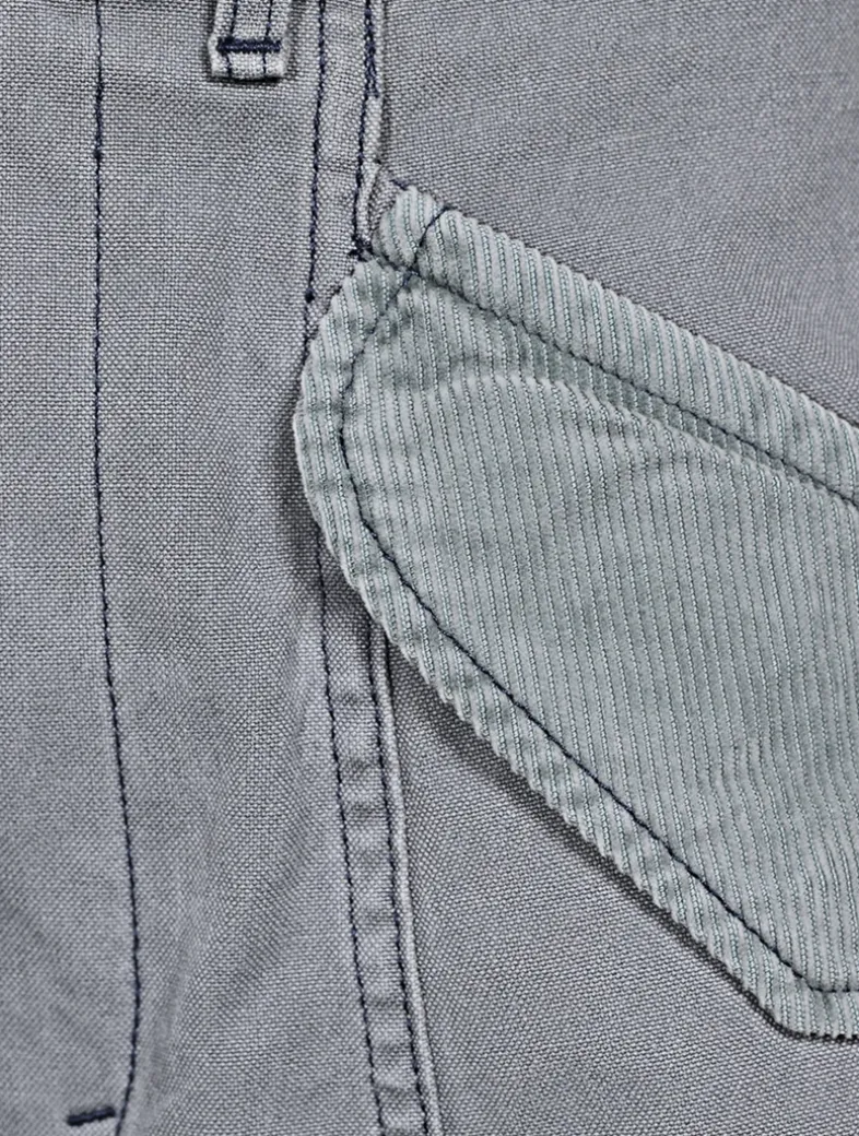 Constructed from faded Japanese canvas and treated with a simple garment wash, these cargo pants are cut to an ankle length with a wide-leg silhouette. The style features extra seaming details on the front and back legs, along with corduroy contrast blocks on the pockets and upper back. Finished with belt loops and multiple pockets at the front and back, this design offers both chic style and functionality.