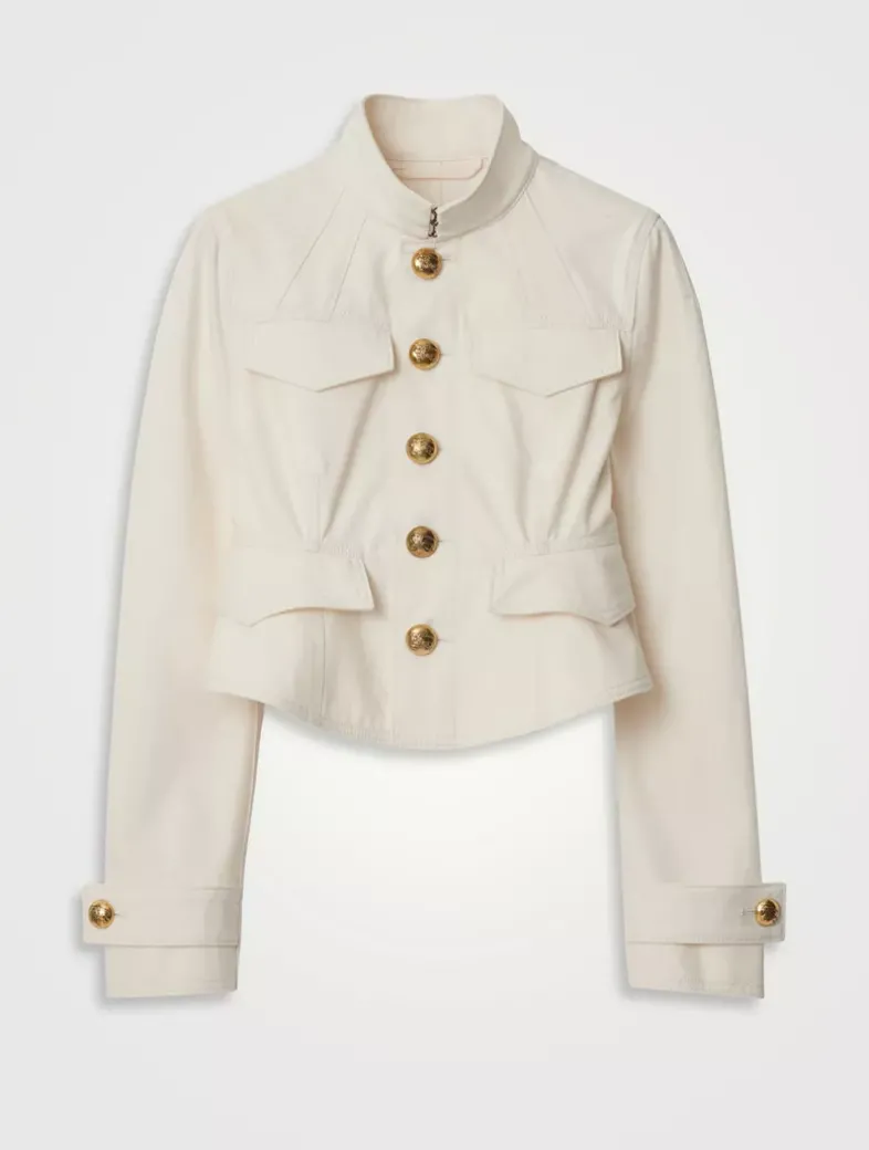 A tailored jacket made in Italy from cotton twill that is brushed for a soft finish. Inspired by uniforms, the stand-collar style features multiple flap pockets and domed Equestrian Knight Design buttons with an antique finish. The cropped silhouette is unlined and cut to a slim fit with darted seams at the neckline.