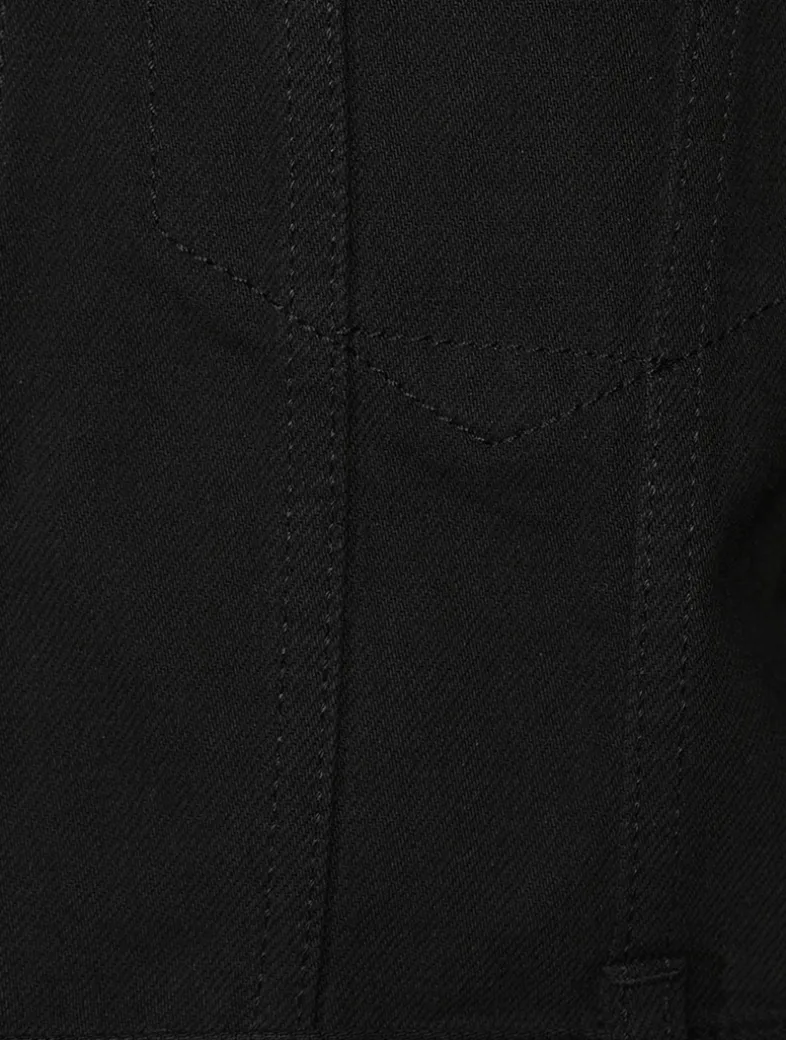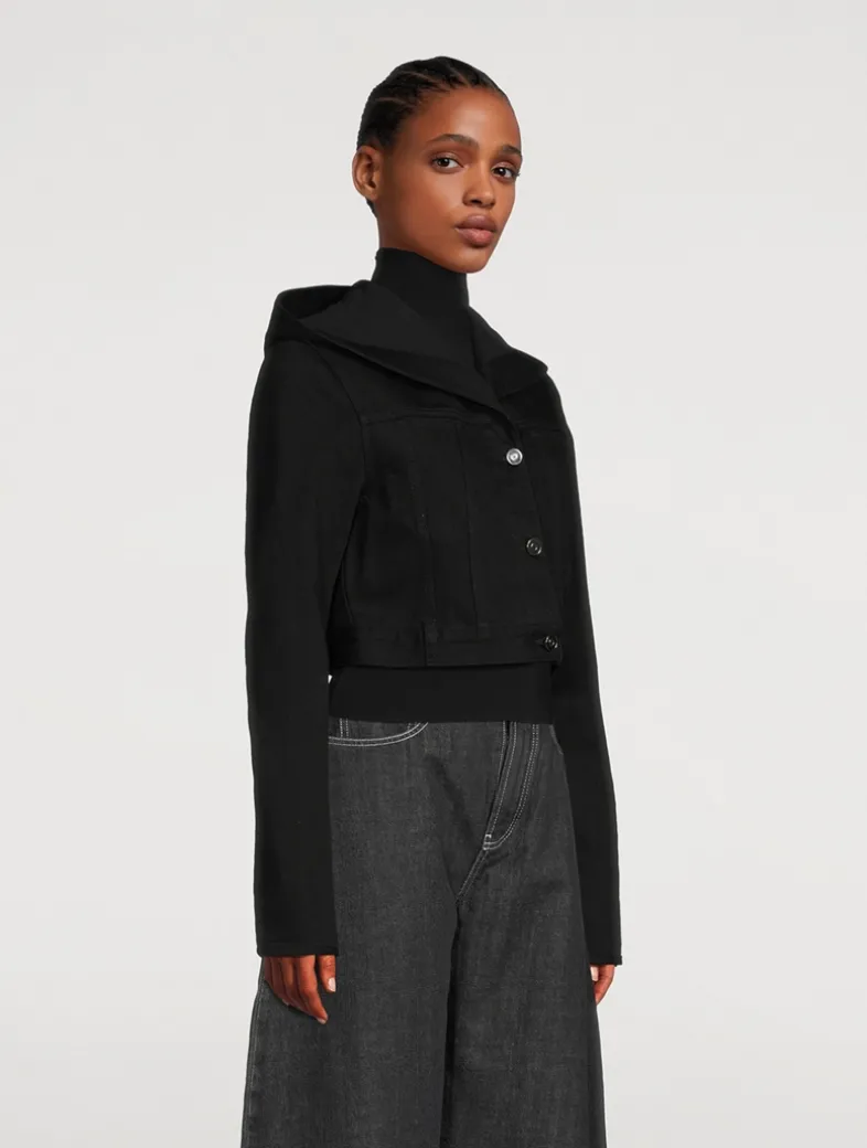 A new take on a timeless trucker jacket, this denim topper has an attached hood and a cropped length. It is made of cotton with a hint of stretch and features classic styling, like a buttoned placket and a panelled construction.
