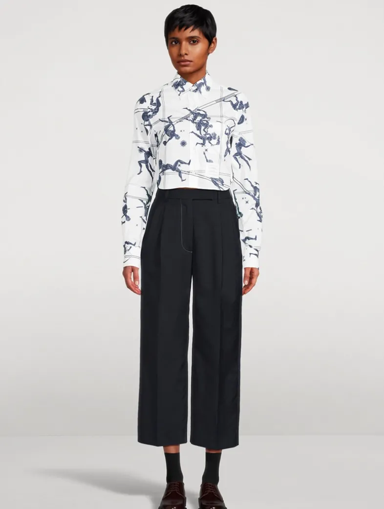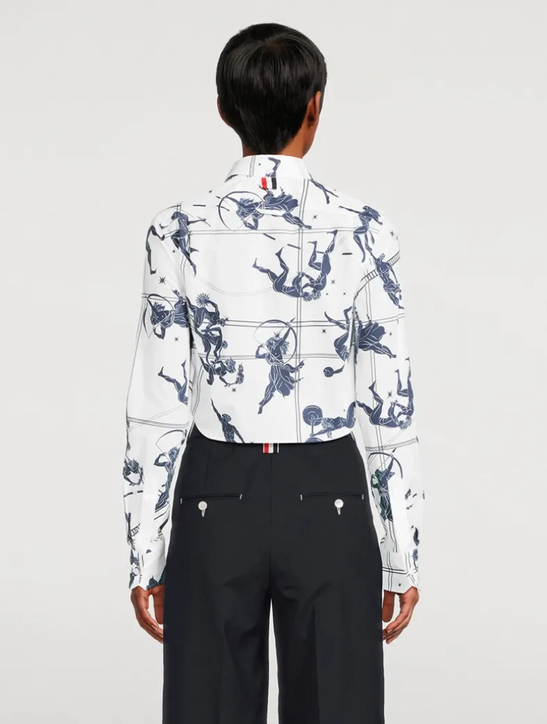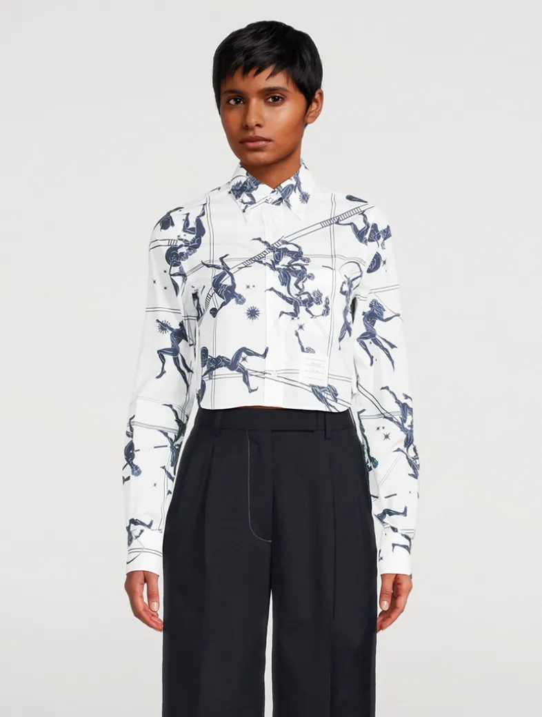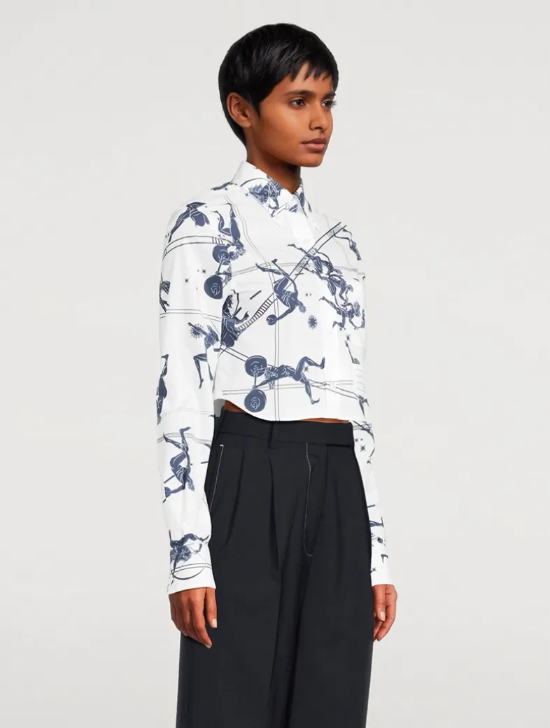 A classic poplin button-down receives an Olympic-level upgrade, featuring ancient Grecian athletes competing across the fabric. It is tailored along a slim silhouette with a cropped length.