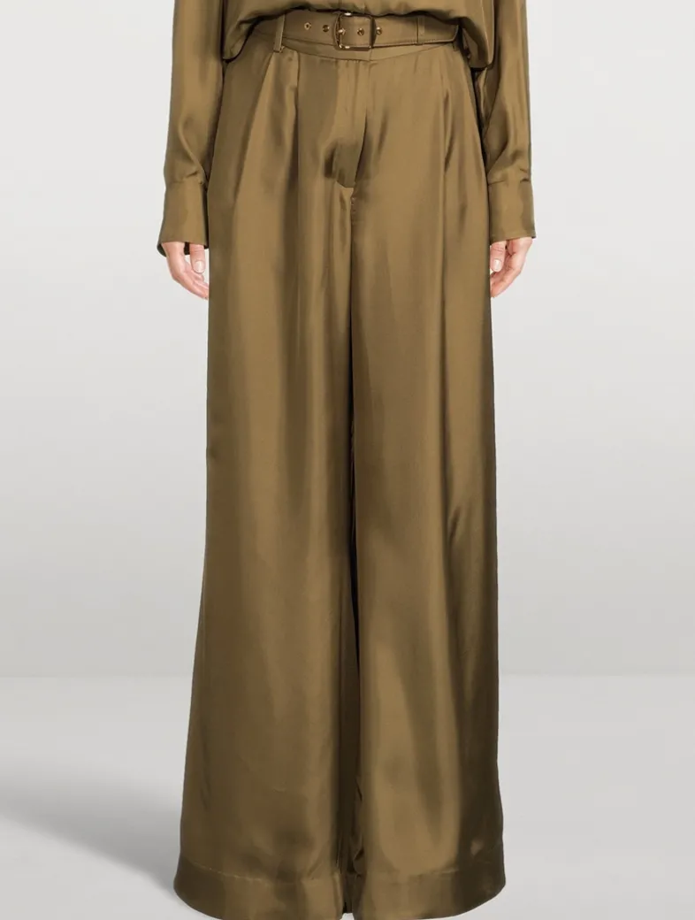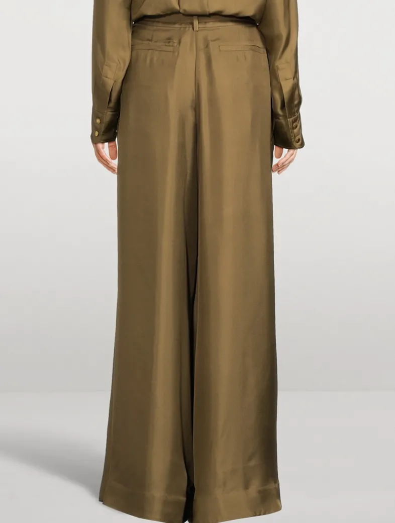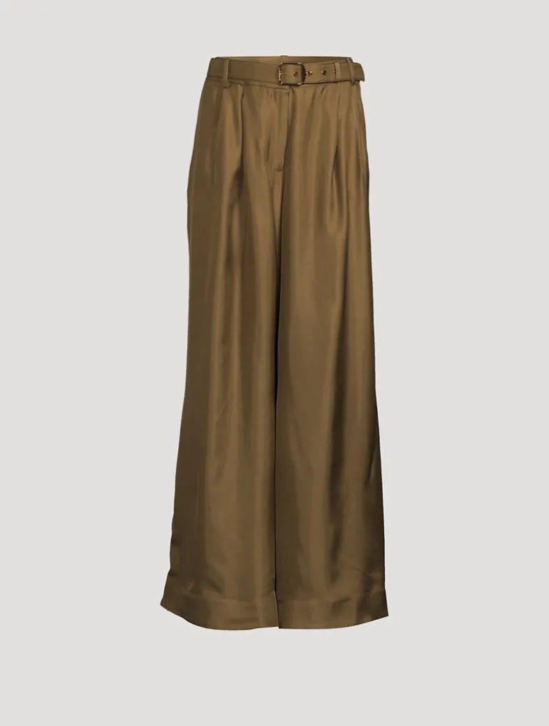Cut to a voluminous wide-leg shape, these fluid silk trousers fall to an elegant drape. They feature classic menswear-inspired styling, including front pleats, a belted waistband, and rear welt pockets.