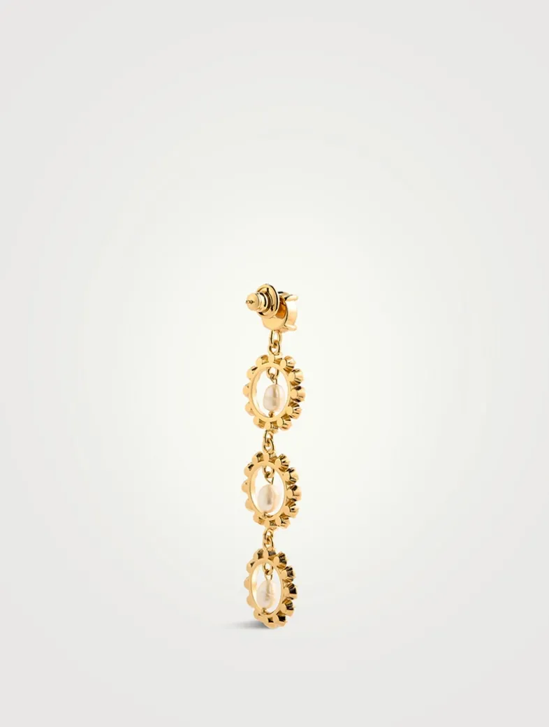 These glamorous drop earrings feature three stacked glass crystal discs, each with a delicate faux pearl at the centre, creating an elegant, cascading effect.