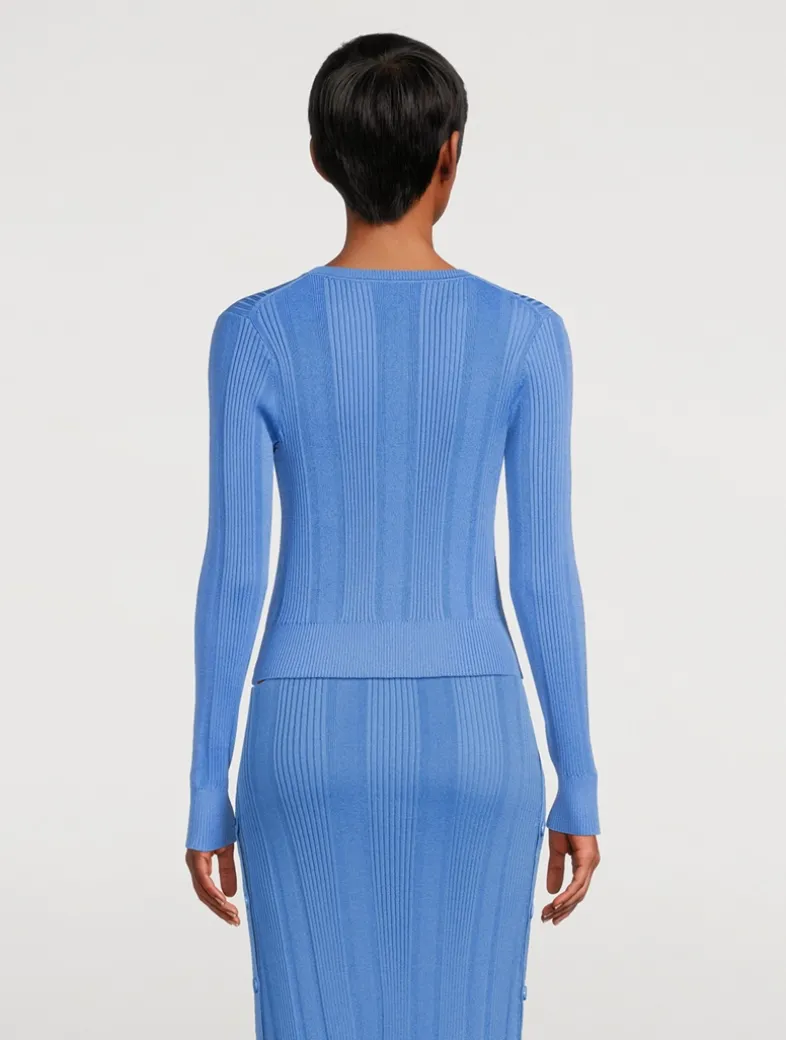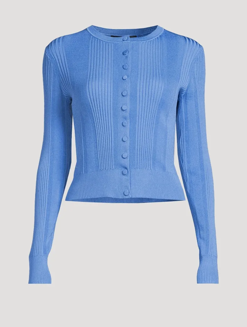 Cut to a curve-hugging silhouette, the Currin Cardigan is crafted from a lightweight knit textured with a column rib. It is accented with buttoned detailing along the center front.