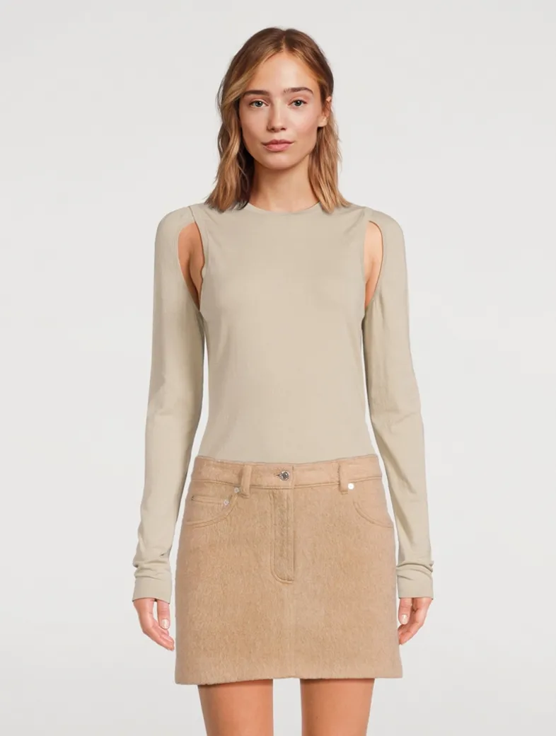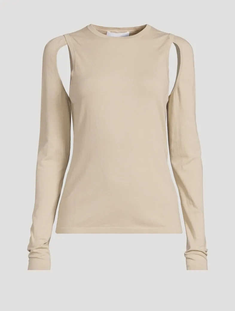 This pullover is crafted of a fine-gauge cotton. It has a slim fit with cut-outs at the underarms. The cut-outs are clean and finished with self knit trims.