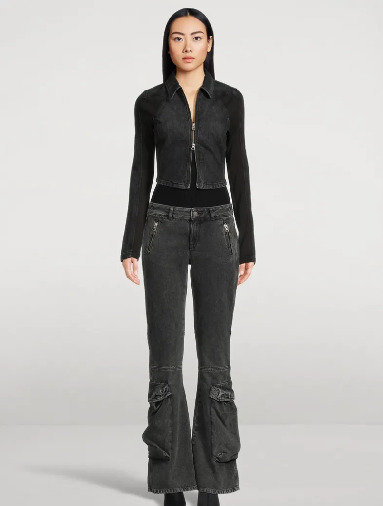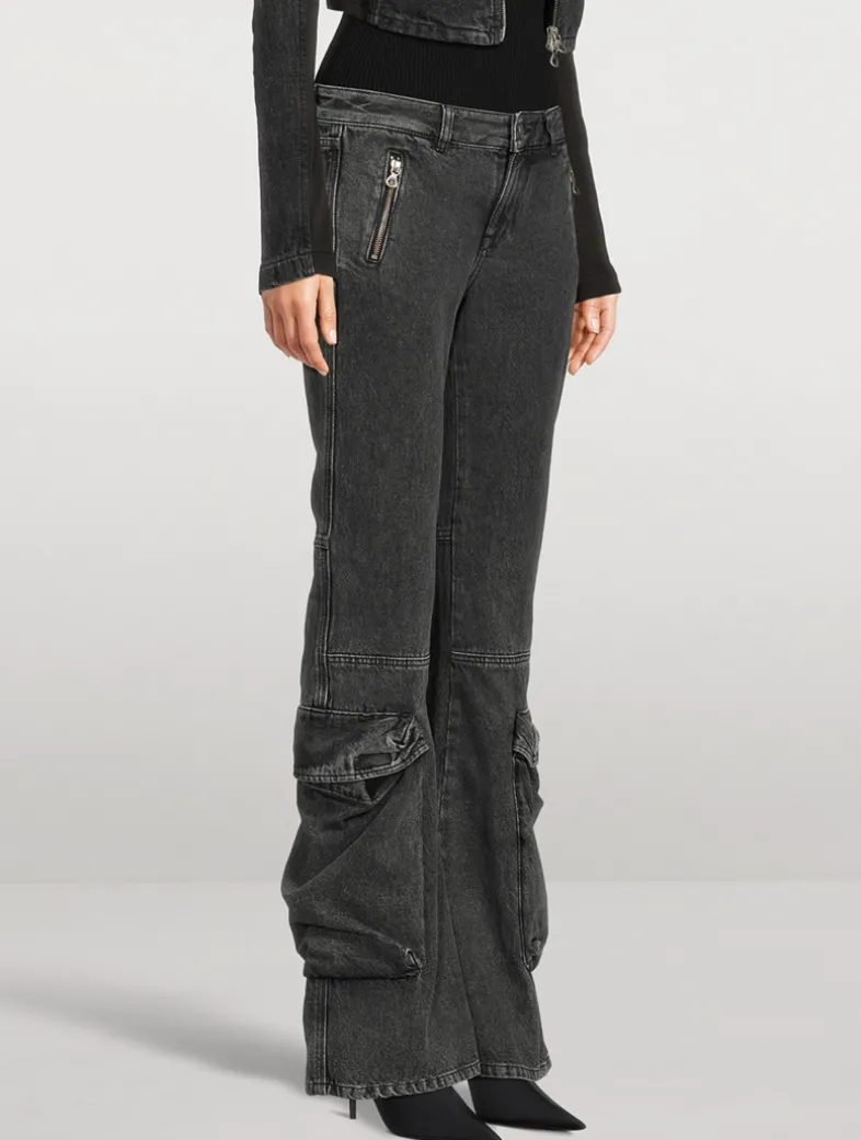 Slim style with a low waist and bootcut leg. The flared silhouette is enhanced by extra-large cargo pockets on the lower part of the leg, while the top part is sleek and minimal with just two zipped pockets on the front.