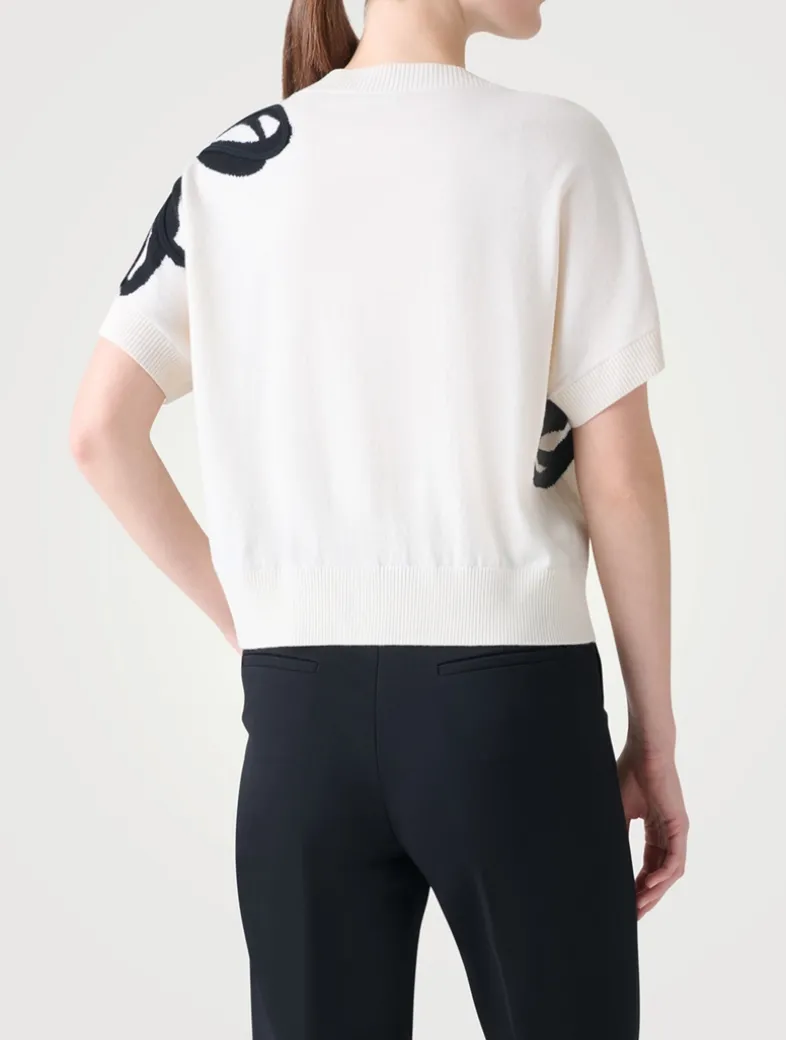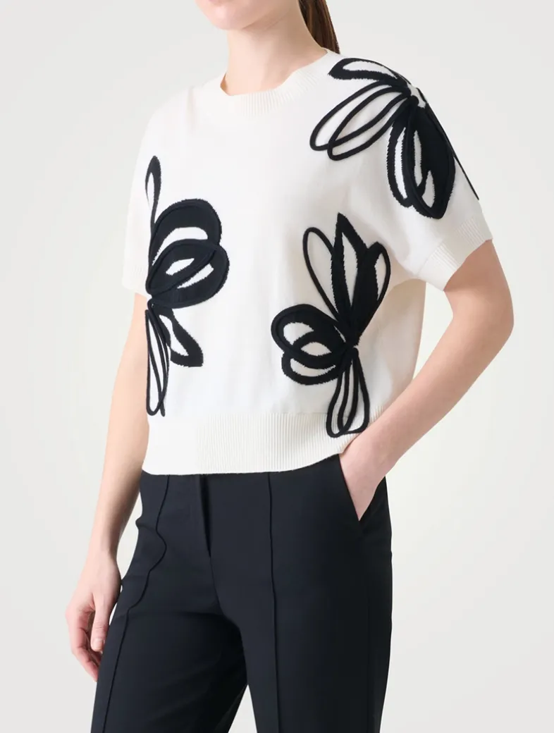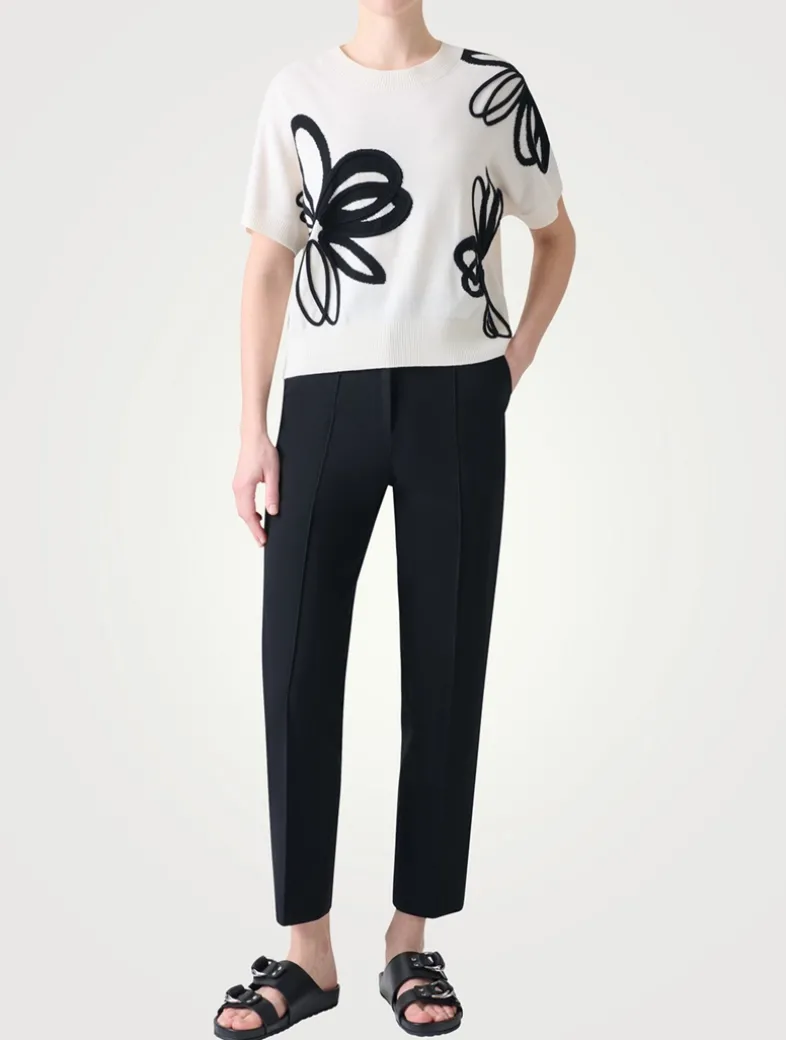 A contrasting daisy motif in a mix of wool and cashmere threads adorns this short-sleeve pullover. Knit from merino wool and cut to a slim silhouette with ribbed trim.