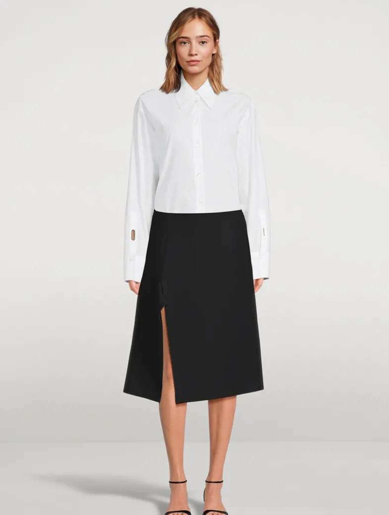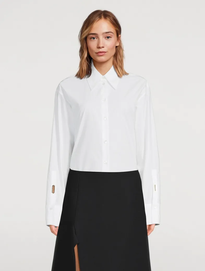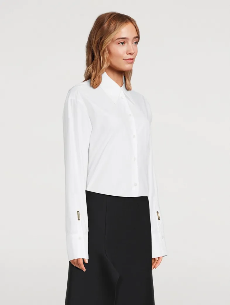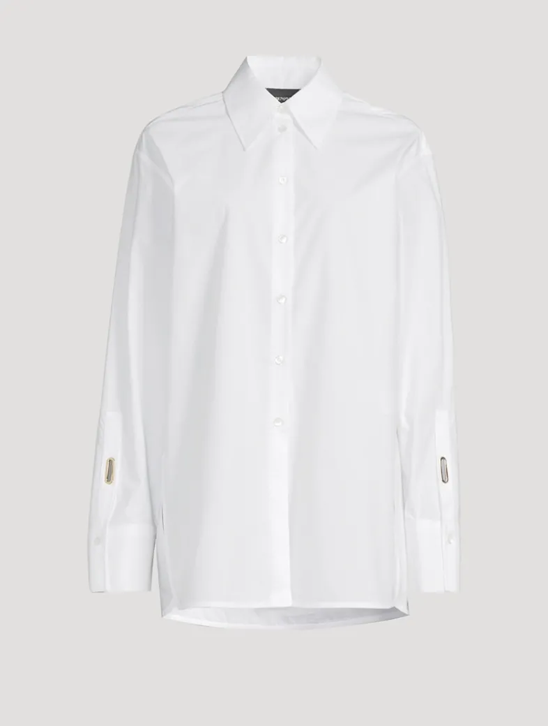 This oversized shirt is crafted in crisp cotton poplin that enhances the clean lines of this extremely lightweight style. A gold-tone eyelet detail at the cuffs completes the piece with distinction. The style is part of the Dawn to Dusk capsule collection, a selection of wardrobe essentials in a colour palette that takes inspiration from the golden light of dawn and the subtle shadows of sunset, creating a mix of warm and sophisticated tones accompanied by darker touches of shade.