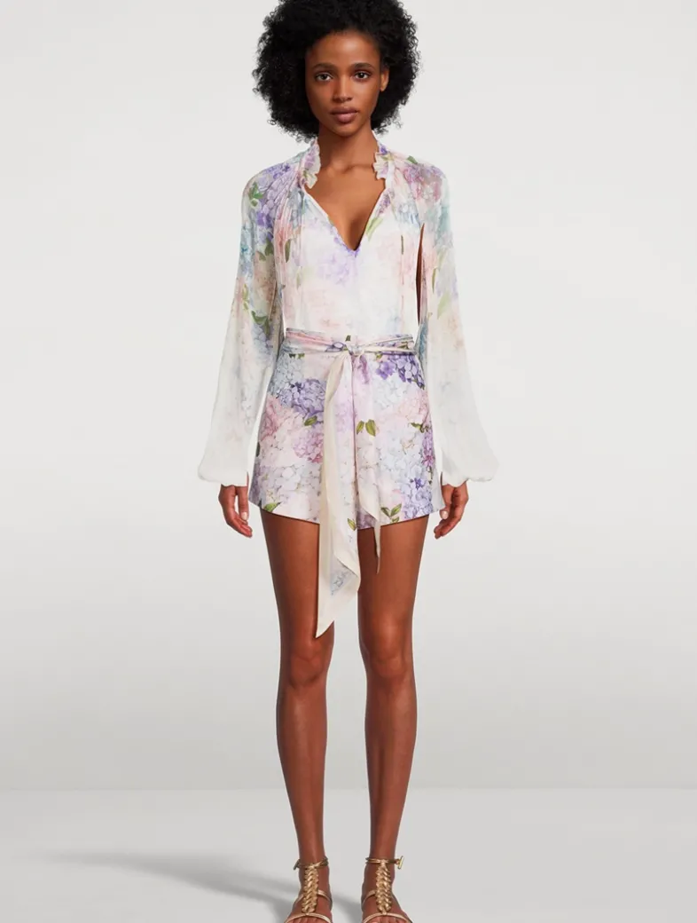 A high-waisted short featuring side seam pockets and a removable scarf belt, finished with a centre back zip. Crafted from silk, they are printed with a lovely hydrangea motif.