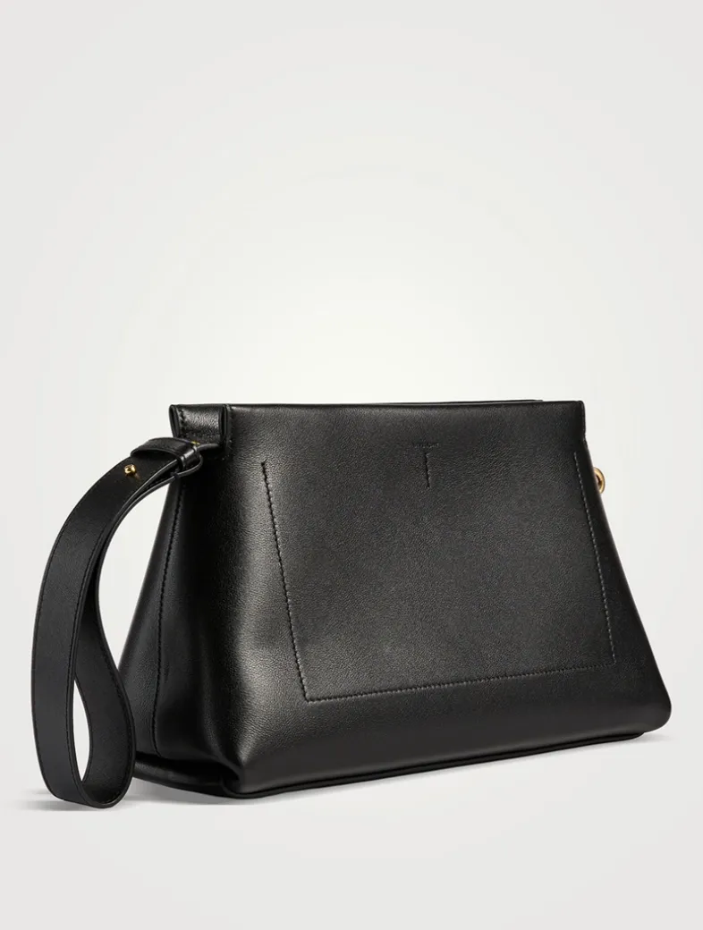 This canvas-lined pouch is crafted from leather and features an interior pocket and a fixed wrist strap.