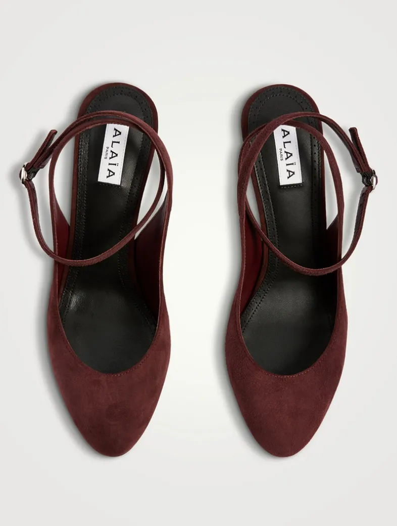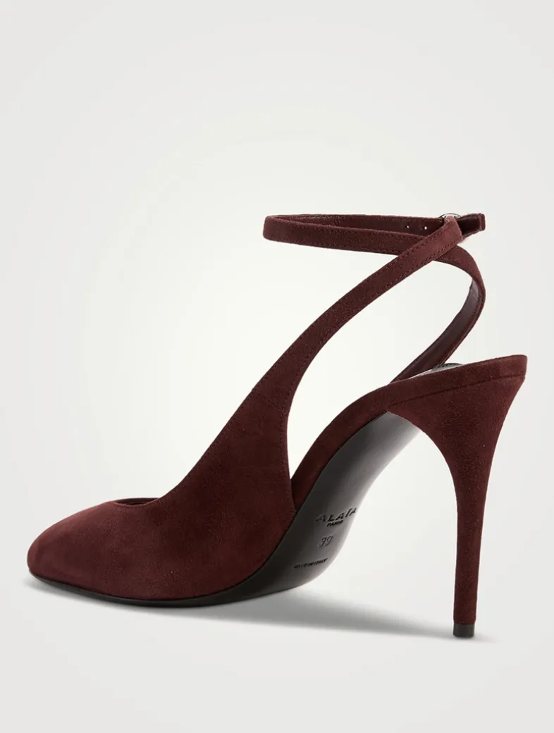 Defined by a signature A-shaped stem, these soft suede pumps are anchored by a slim stiletto heel. The almond-toe pair are finished with a delicate buckled strap around the ankle.