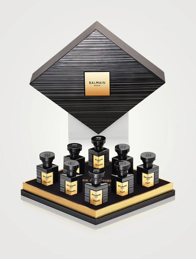 What It Is: Eight 4 ml miniature fragrance bottles offered in a black and gold box embossed with the signature rayure Balmain.