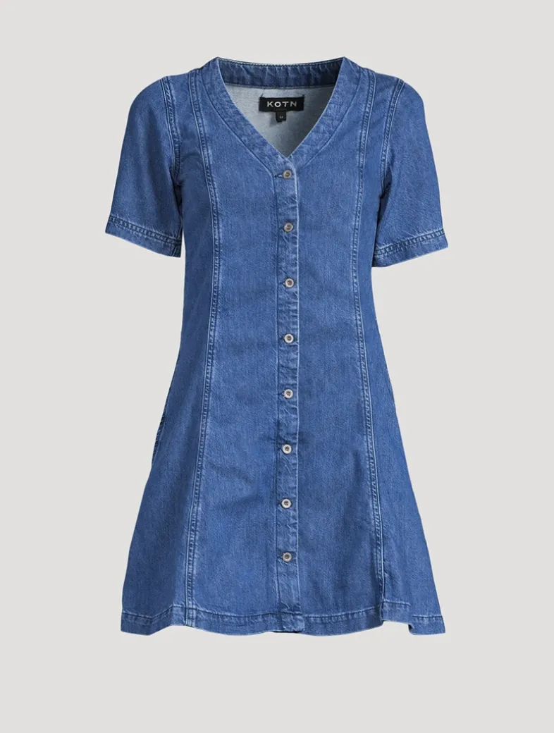 This dress is crafted from 100% cotton denim, designed with a form-fitted silhouette that gently flares into a subtle A-line mini skirt. Featuring a flattering V-neckline and a full button front, it’s an effortless staple that transitions from day to night with ease.