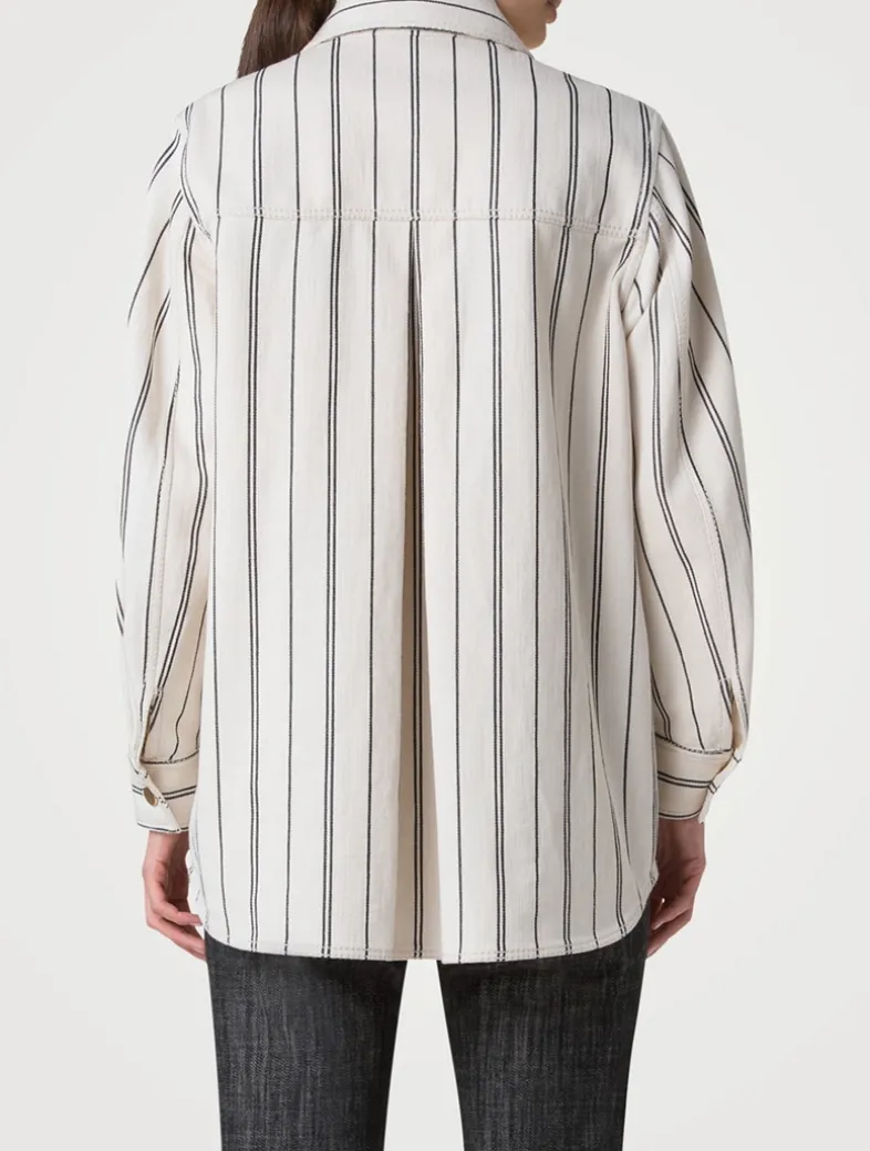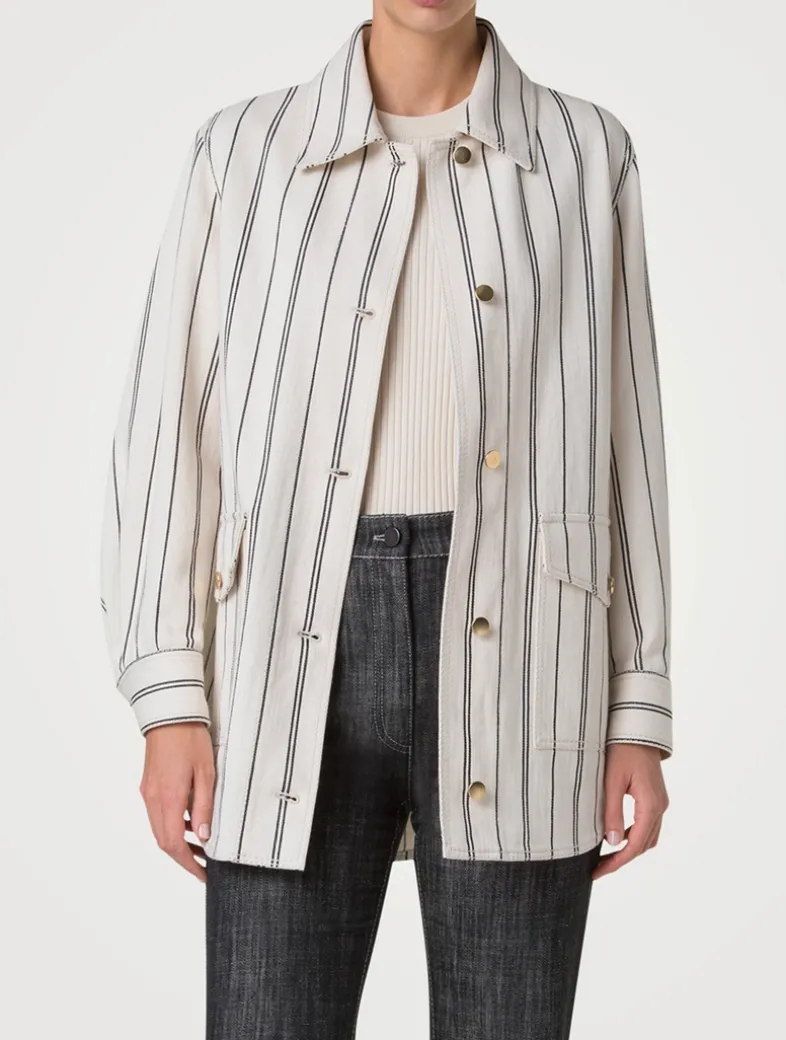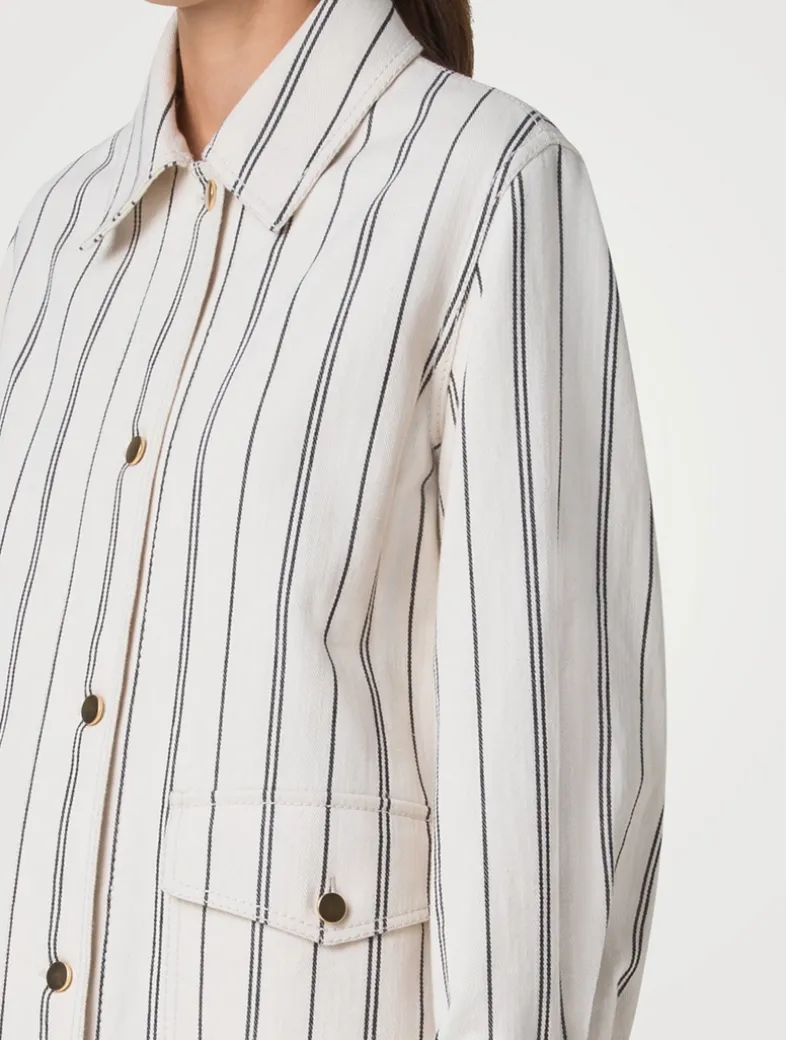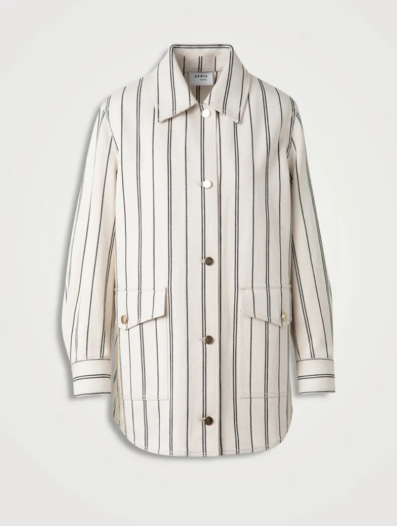 Vertical stripes define this cotton gabardine denim jacket. Cut in an oversize silhouette, it features a buttoned closure, patch flap pockets at the waist, and an inverted back pleat to enhance its borrowed-from-the-boys shape.