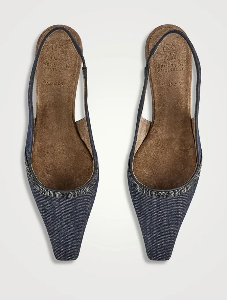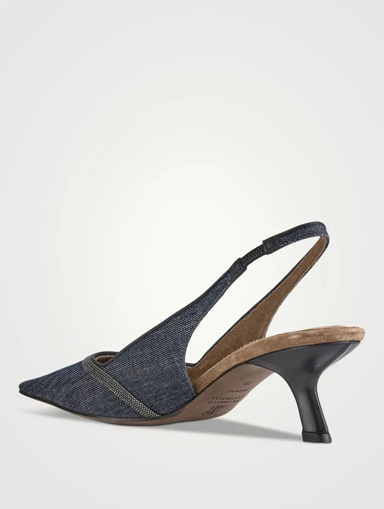 An elegant aesthetic, a contemporary design, and sparkling details define these denim heels. The thin slingback strap is elasticized for the perfect fit, while signature monili beading highlights the vamp.