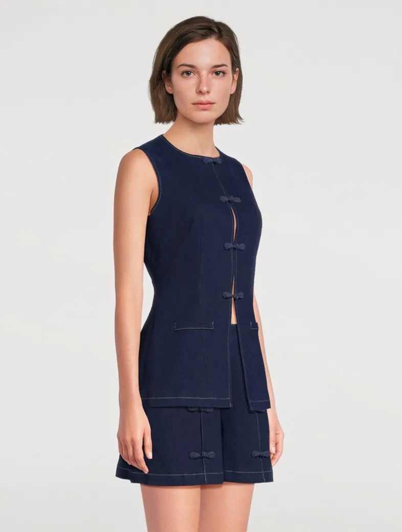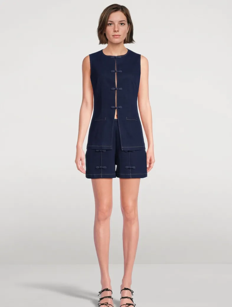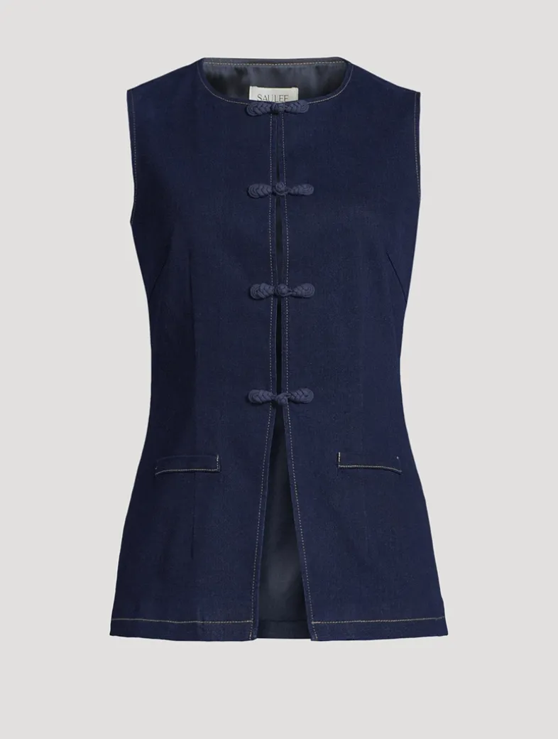 Crafted from a cotton-blend stretch denim, this vest features SAU LEE’s signature pipa knot detail.