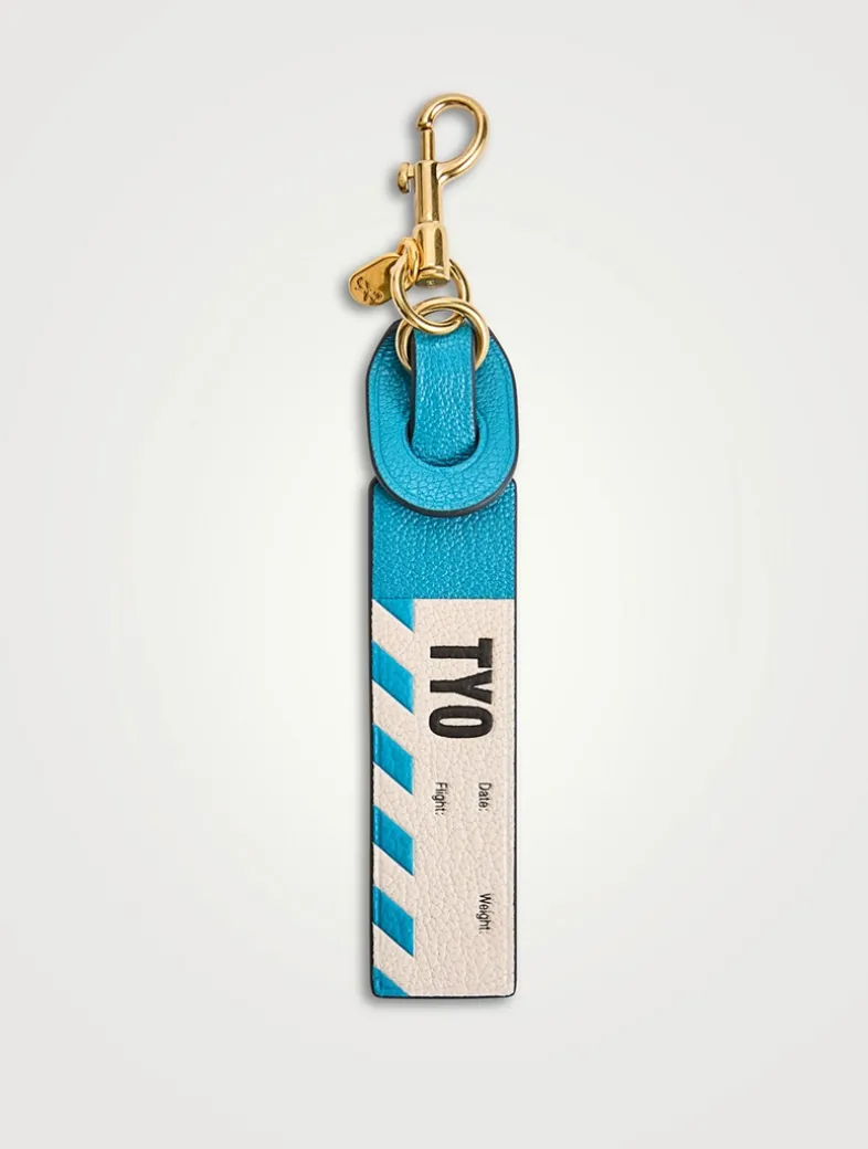This charm is crafted from capra leather to resemble a retro luggage tag. It will be an eye-catching addition to your everyday tote; simply clip it on using the gold-tone clasp.