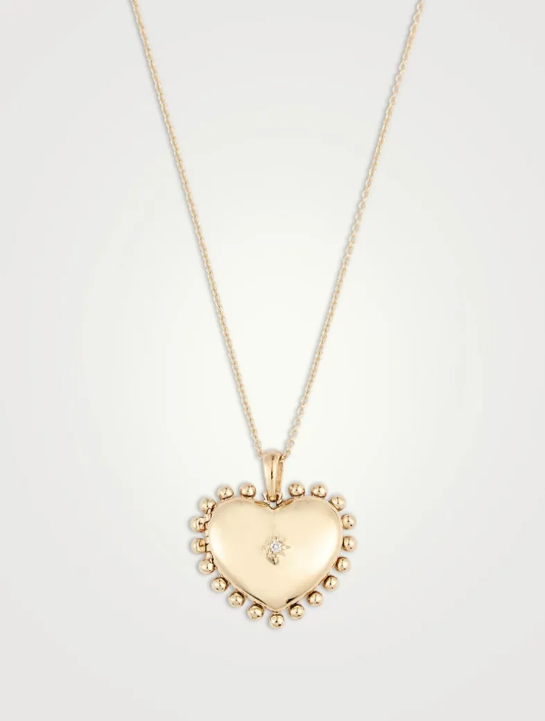 Suspended from a thin 14k gold cable chain, this delicate necklace is designed with a heart-shaped locket featuring a star with a diamond center.