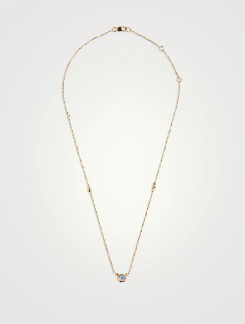 Bezel set and suspended from a sparkling chain, this opal pendant necklace is petite and dainty. Crafted in 14k gold with the brand’s signature dew drop detailing.