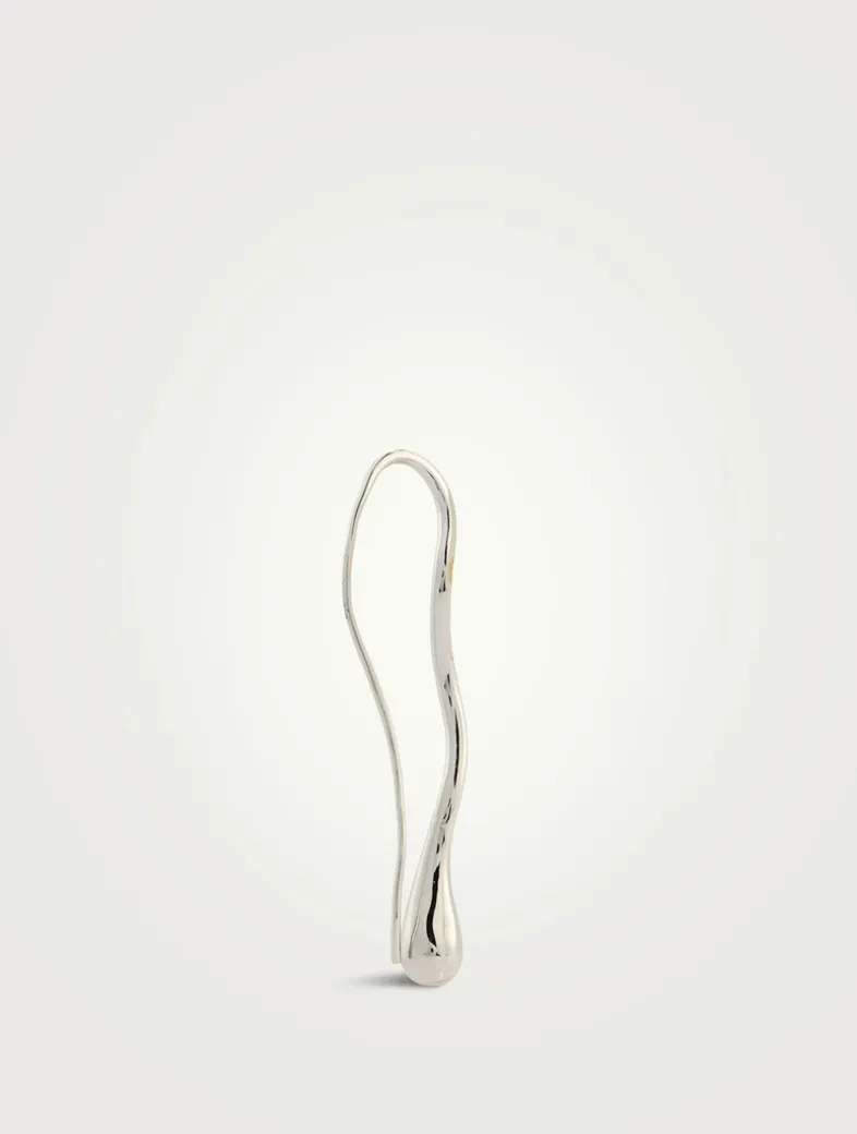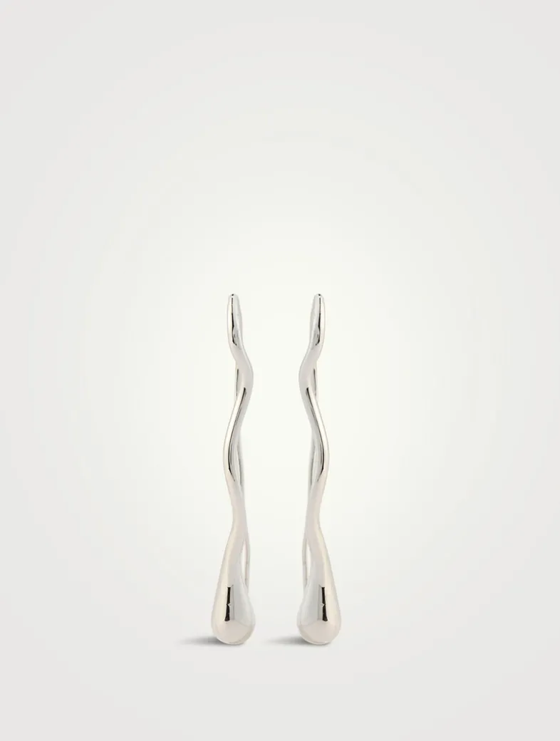 These threader-style earrings with a 3D droplet charm from the Dezi x Luv Aj collection feature an organic squiggly metal design and thin wire backings for any standard piercing. Made from plated brass with waterproof, tarnish-free high-polish rhodium plating, they are mounted on hypoallergenic surgical steel posts and are 100% nickel- and cadmium-free.