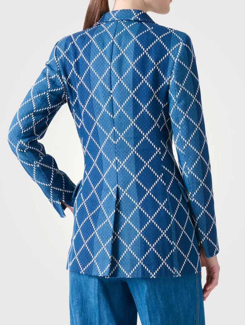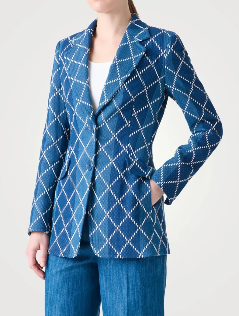 This denim jacket mixes a casual fabrication with a timeless silhouette. It features a diamond-shaped jacquard pattern and classic tailored detailing, including flap pockets and a lapel collar.
