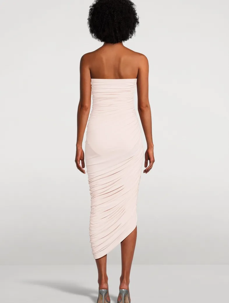 Flaunting shirred sides and soft, allover ruching, this knee-length dress exudes a classic simplicity. It is cut in a curve-hugging silhouette with a strapless neckline and an asymmetric hem. A four-way stretch bodysuit is built in the garment for comfort and to create the drape of this style. For easy fit and more draping, choose one size higher.