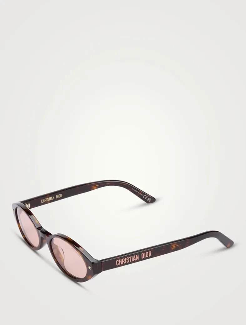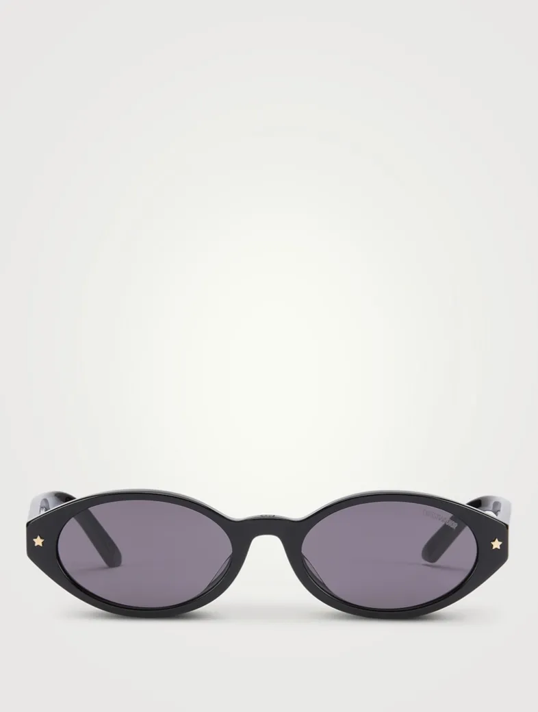These playful low oval frames are detailed with contrasting logos and gold metal star pins.
